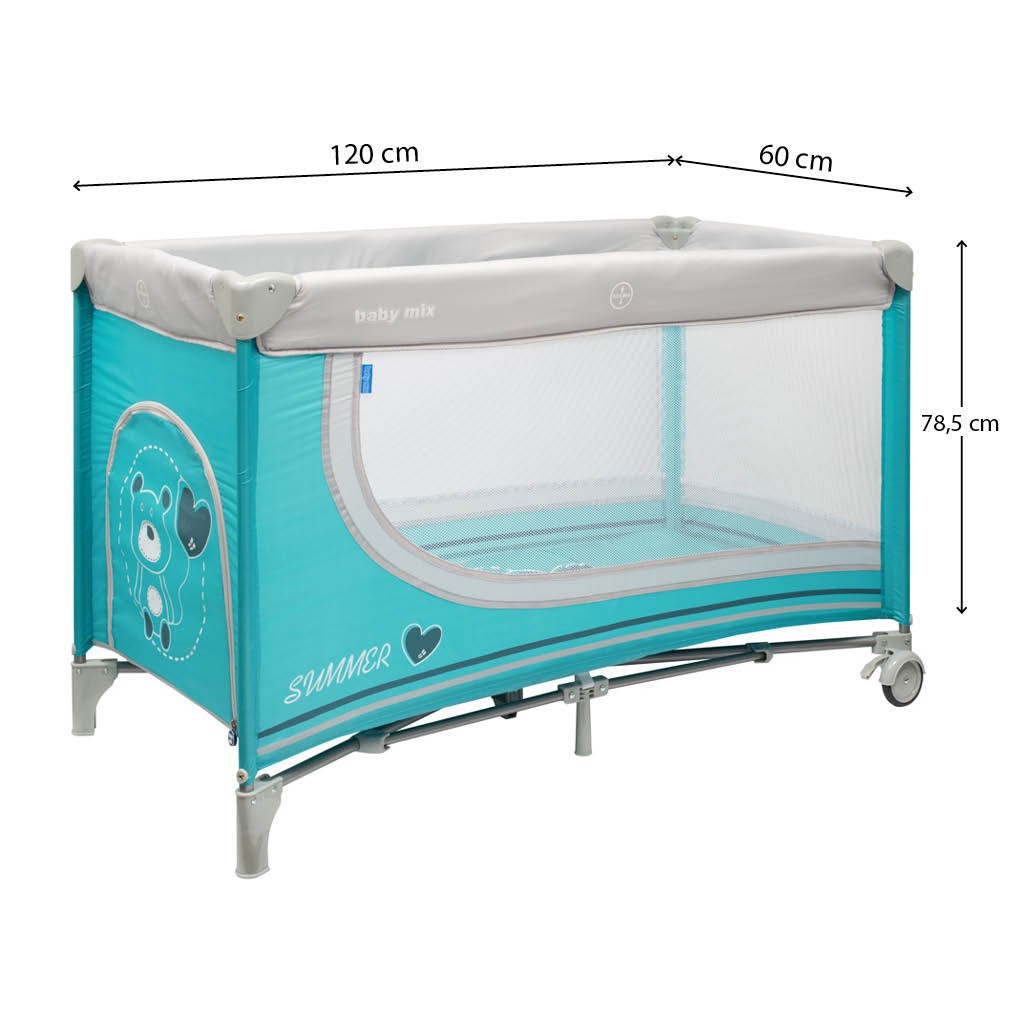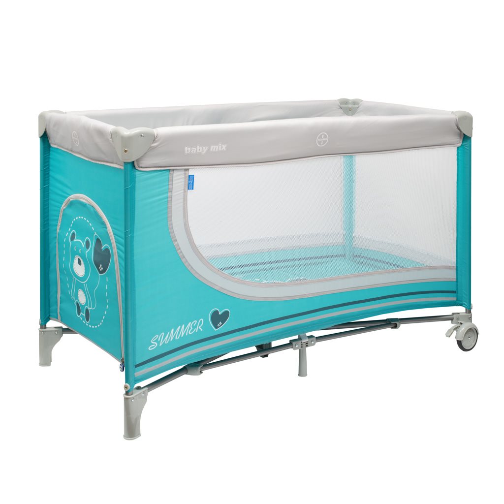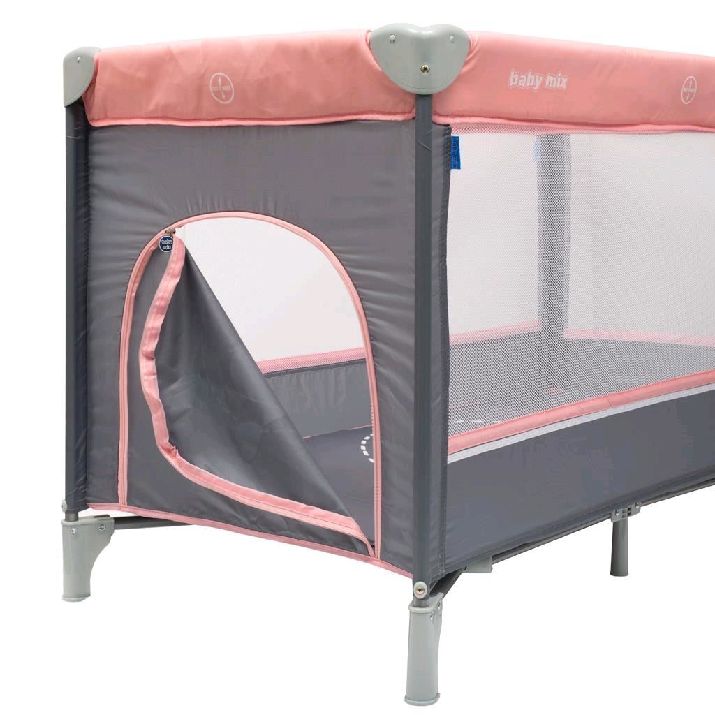 Jednopoziomowe łóżeczko podróżne marki Baby Mix. Dzięki składanej konstrukcji może pełnić zarówno funkcję przenośnego łóżeczka, przeznaczonego na wyjazdy, jak i domowego kojca, służącego zabawie.