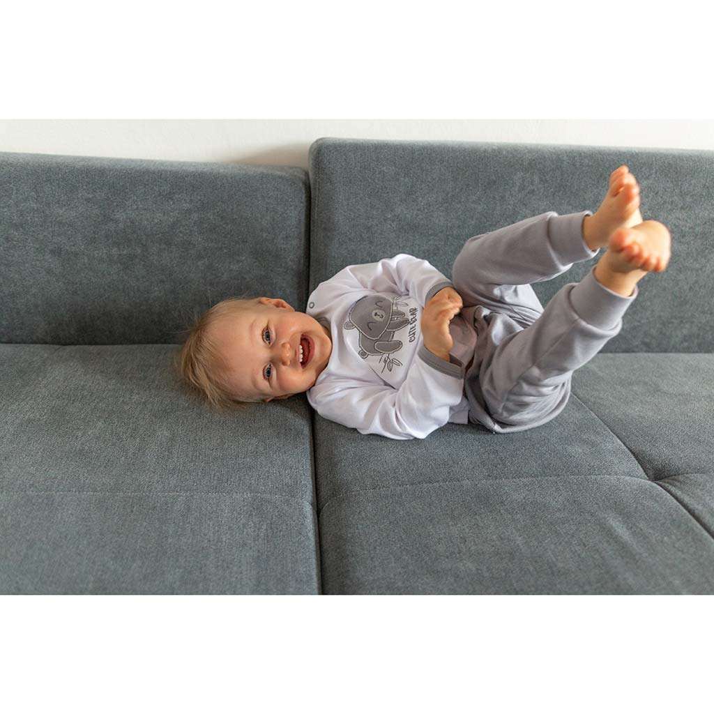 2-częściowy komplet New Baby Cute Bear dla niemowląt. Komplet wykonany z bardzo przyjemnego i miękkiego materiału wysokiej jakości, który jest idealny dla niemowląt. W zestawie znajduje się koszulka i spodnie dresowe. Koszula ozdobiona haftowanym obrazkiem misia podszytym tkaniną zapobiegającą zarysowaniom. Zapinanie na napę na ramieniu. Spodnie dresowe ozdobione szerszą lamówką posiadają zwężane nogawki i dwa ozdobne guziki. W tym precyzyjnie i solidnie wykonanym komplecie maluszek poczuje się bardzo komfortowo. Nadążamy za modą dziecięcą, dlatego oferujemy Państwu naszą kolekcję New Baby Cute Bear. Skład: 100% bawełna.