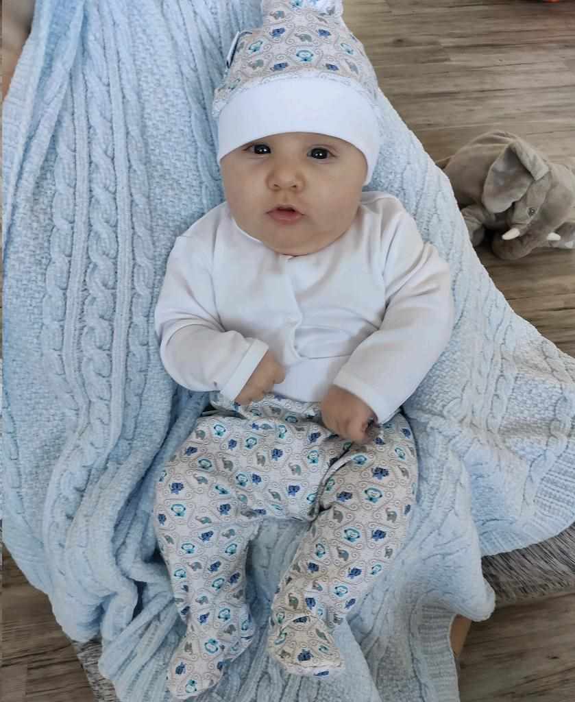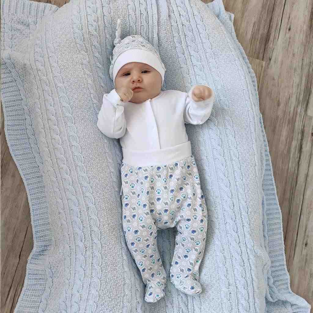 Śliczny 3-częściowy bawełniany komplet New Baby Kiddy. Komplet składający się z czapki, body i półśpiochów jest wprost stworzony dla niemowląt od pierwszego dnia życia ze względu na miękkość i delikatność. Półśpiochy ozdobione są uroczym dziecięcym nadrukiem. W pasie znajduje się szersza elastyczna lamówka. Jednokolorowe body z długim rękawem zapina się na napy na całej długości oraz między nogami, co ułatwia ubieranie i przewijanie. Czapka ozdobiona uroczym dziecięcym nadrukiem z węzełkiem u góry. Wykończenie jest szerokie i nie uciska główki dziecka. Komplet wykonany jest z przyjemnego i wysokojakościowego materiału, w którym Twoje dziecko poczuje się komfortowo. Skład: 100% bawełna.