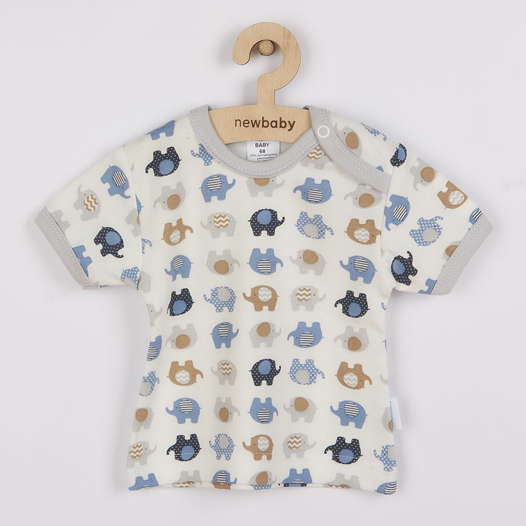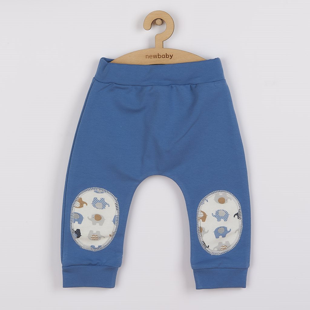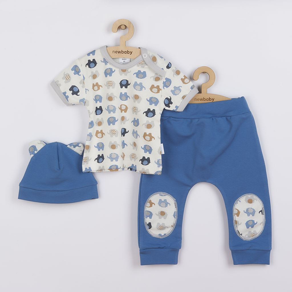 Stylowy 3-częściowy komplet dla niemowląt New Baby Magic elephant. Komplet składa się ze spodni dresowych, t-shirta i czapki. Koszulka z krótkim rękawem posiada nadruk w słoniki. Bez zapięcia, przez główkę. Spodnie dresowe posiadają szersze wykończenie z gumką w talii, szerszą lamówkę na nogawkach i łaty na kolanach ozdobione w słonie. Czapka jest jednokolorowa z uszkami. Nadaje się na spacery lub jako ubranie po domu. Stylowy 3-częściowy komplet jest niezwykle użyteczną i praktyczną częścią ubioru dla dzieci. Wykonany jest z bardzo przyjemnego materiału. Skład: koszulka: 100% bawełna, spodnie dresowe i czapka: 95% bawełna, 5% elastan.