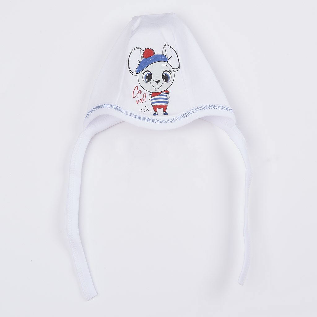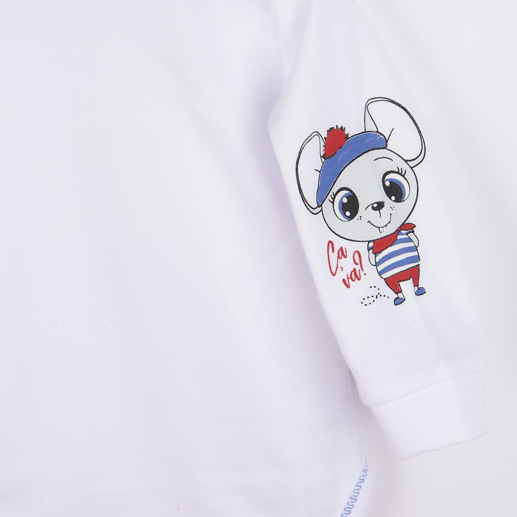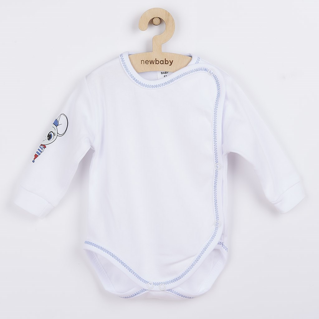 Piękny niemowlęcy bawełniany 4-częściowy komplet New Baby. Komplet składa się z wiązanej czapeczki , body z długim rękawem i bocznym zapięciem, śpiochów i rękawiczek. Wesoły obrazek na czapeczce, body oraz śpiochach został wydrukowany przy użyciu certyfikowanych barwników, bezpiecznych dla niemowląt. Nasz komplet uszyty jest z przyjemnego materiału wysokiej jakości, w którym Wasze dziecko poczuje się komfortowo. Body posiada praktyczne zapięcie na napy na całej długości oraz między nogami, co ułatwia ubieranie i przewijanie niemowlaka. Śpiochy zapinane są na napy na ramionach i między nóżkami. Skład; 100% bawełny. Rozmiar: śpiochy – obwód wokół klatki piersiowej 48 cm, długość od ramion 49 cm, długość od kroku ok. 17 cm, body – obwód wokół klatki piersiowej 44 cm, długość od ramion 34 cm, długość rękawów ok. 19 cm. Rękawiczki 9 cm. Czapeczka – obwód wokół głowy 38 cm.
