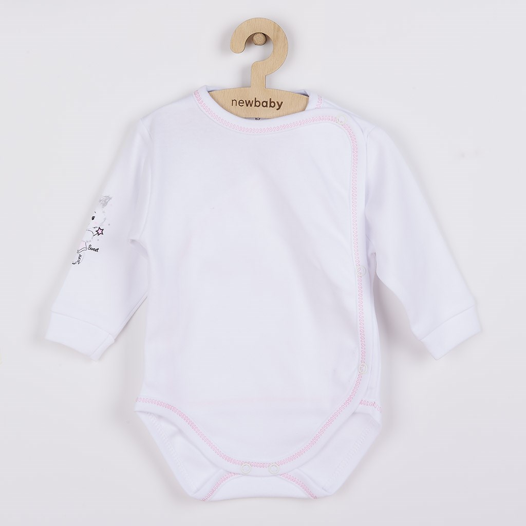 Piękny niemowlęcy bawełniany 4-częściowy komplet New Baby. Komplet składa się z wiązanej czapeczki , body z długim rękawem i bocznym zapięciem, śpiochów i rękawiczek. Wesoły obrazek na czapeczce, body oraz śpiochach został wydrukowany przy użyciu certyfikowanych barwników, bezpiecznych dla niemowląt. Nasz komplet uszyty jest z przyjemnego materiału wysokiej jakości, w którym Wasze dziecko poczuje się komfortowo. Body posiada praktyczne zapięcie na napy na całej długości oraz między nogami, co ułatwia ubieranie i przewijanie niemowlaka. Śpiochy zapinane są na napy na ramionach i między nóżkami. Skład; 100% bawełny. Rozmiar: śpiochy – obwód wokół klatki piersiowej 45 cm, długość od ramion 47 cm, długość od kroku ok. 16 cm, body – obwód wokół klatki piersiowej 42 cm, długość od ramion 32 cm, długość rękawów ok. 18 cm. Rękawiczki 8cm. Czapeczka – obwód wokół głowy 36cm.
