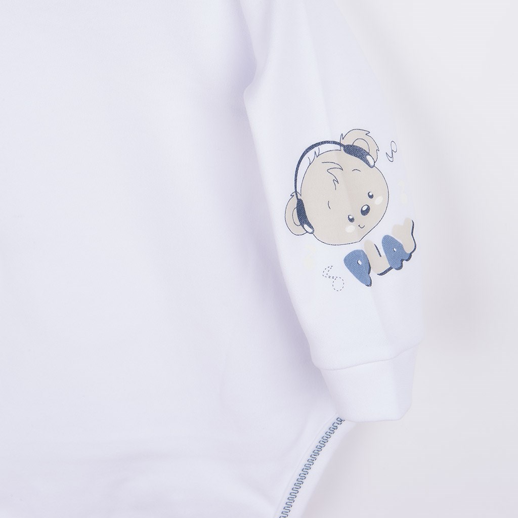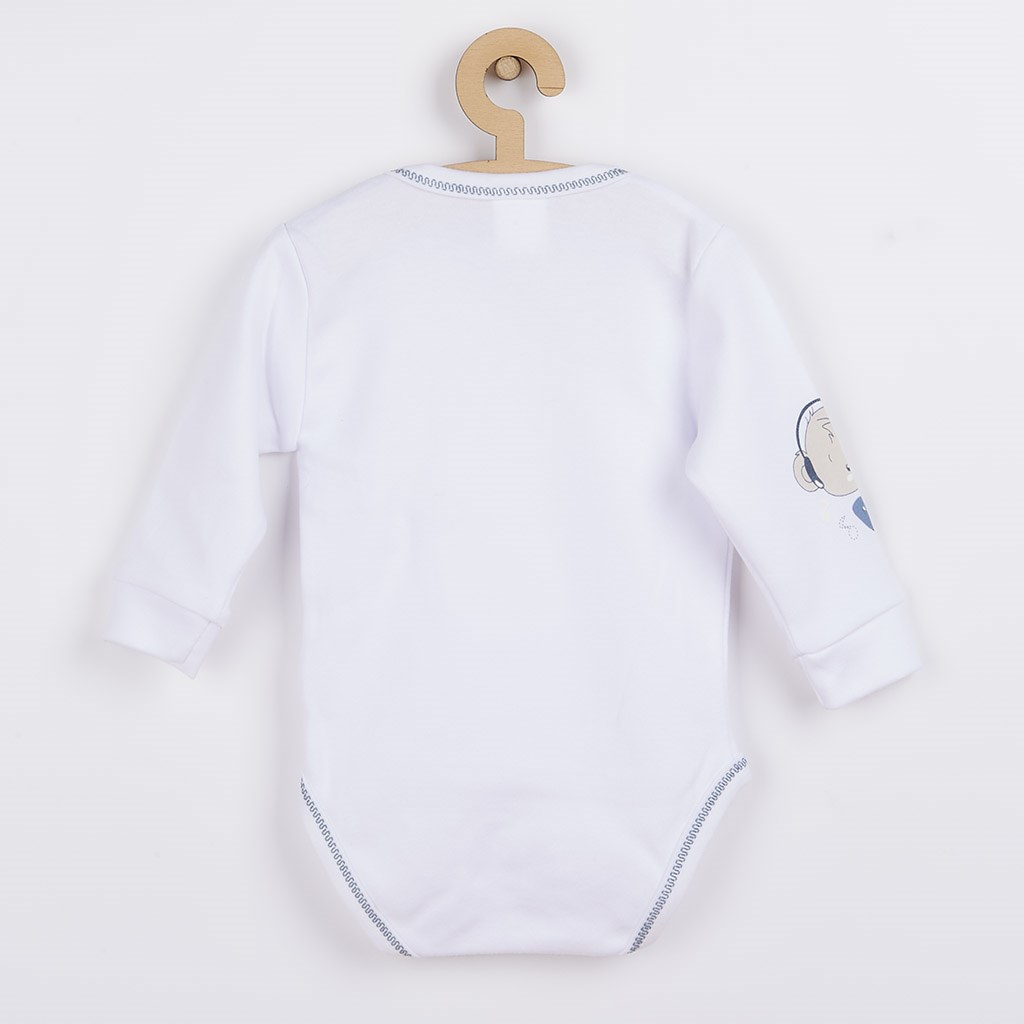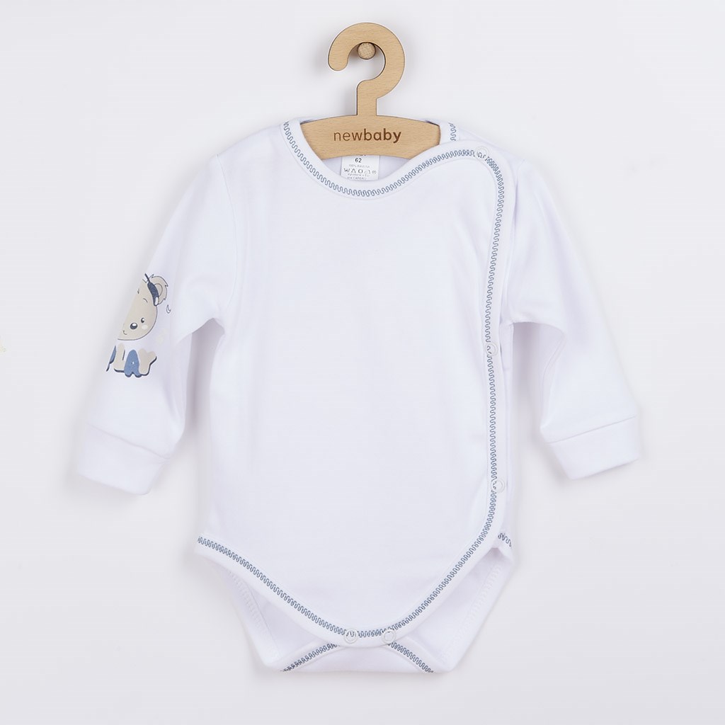 Piękny niemowlęcy bawełniany 4-częściowy komplet New Baby. Komplet składa się z wiązanej czapeczki , body z długim rękawem i bocznym zapięciem, śpiochów i rękawiczek. Wesoły obrazek na czapeczce, body oraz śpiochach został wydrukowany przy użyciu certyfikowanych barwników, bezpiecznych dla niemowląt. Nasz komplet uszyty jest z przyjemnego materiału wysokiej jakości, w którym Wasze dziecko poczuje się komfortowo. Body posiada praktyczne zapięcie na napy na całej długości oraz między nogami, co ułatwia ubieranie i przewijanie niemowlaka. Śpiochy zapinane są na napy na ramionach i między nóżkami. Skład; 100% bawełny. Rozmiar: śpiochy – obwód wokół klatki piersiowej 48 cm, długość od ramion 49 cm, długość od kroku ok. 17 cm, body – obwód wokół klatki piersiowej 44 cm, długość od ramion 34 cm, długość rękawów ok. 19 cm. Rękawiczki 9 cm. Czapeczka – obwód wokół głowy 38 cm.