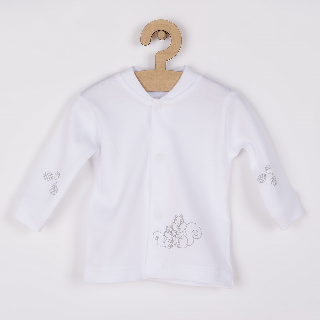 Komplet niemowlęcy z obrazkiem wiewiórek, New baby. Komplet jest odpowiedni nie tylko do szpitala. Wykonany jest z wysokiej jakości materiałów. W zestawie znajdują się: koszulka, kaftanik, śpiochy, czapka i rękawiczki. Śpiochy posiadają zapięcie na ramionach i między nóżkami, co bardzo ułatwia ubieranie i przewijanie. Przód zdobią urocze wiewiórki. Czapka jest wiązana na sznurówki. Kaftanik jest zapinany wzdłuż całej długości. Koszulka jest ozdobiona obrazkiem wiewiórek i ma bardzo praktyczne zapięcie na napy z boku, co ułatwia przewijanie maleństwa. Rękawiczki ogrzewają dłonie dziecka i chronią go przed zadrapaniami. Zestaw jest wysyłany w praktycznym pudełku i dlatego też jest idealny na prezent. Skład: 100% bawełna. Rozmiary: śpiochy – obwód klatki piersiowej 44 cm, długość całkowita 44 cm, długość od krocza 15 cm. Kaftanik – długość 26 cm, obwód wokół klatki piersiowej 44 cm, długość rękawa 18 cm. Koszulka - długość 26 cm, obwód wokół klatki piersiowej 44 cm, długość rękawa 18 cm. Rękawiczki 10 cm. Czapeczka – obwód wokół głowy 38 cm.