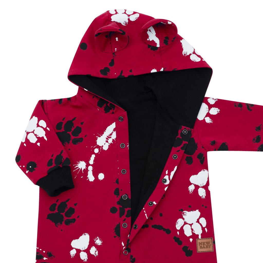 Pomysłowy bawełniany pajacyk niemowlęcy New Baby Paw. Pajacyk w całości zadrukowany zabawnym wzorem. Wykonany jest z wysokiej jakości materiału bawełnianego z dodatkiem elastanu oraz z bawełnianej podszewki. Materiał jest gładki i przyjemny w dotyku. Praktyczne zapinanie na napy na całej długości znacznie ułatwia ubieranie i przewijanie. Pajac posiada praktyczny kaptur z uszkami oraz szersze elastyczne obszycia na rękawach i nogawkach, a cała wewnętrzna strona podszyta jest ciepłą bawełnianą podszewką, która zwiększa komfort noszenia. W kombinezonie dziecko poczuje się niezwykle wygodnie i komfortowo. Skład: 95% bawełna, 5% elastan, podszewka - 95% bawełna, 5% elastan. Idealny na jesień i wiosnę.