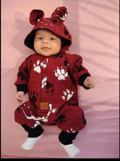 Pomysłowy bawełniany pajacyk niemowlęcy New Baby Paw. Pajacyk w całości zadrukowany zabawnym wzorem. Wykonany jest z wysokiej jakości materiału bawełnianego z dodatkiem elastanu oraz z bawełnianej podszewki. Materiał jest gładki i przyjemny w dotyku. Praktyczne zapinanie na napy na całej długości znacznie ułatwia ubieranie i przewijanie. Pajac posiada praktyczny kaptur z uszkami oraz szersze elastyczne obszycia na rękawach i nogawkach, a cała wewnętrzna strona podszyta jest ciepłą bawełnianą podszewką, która zwiększa komfort noszenia. W kombinezonie dziecko poczuje się niezwykle wygodnie i komfortowo. Skład: 95% bawełna, 5% elastan, podszewka - 95% bawełna, 5% elastan. Idealny na jesień i wiosnę.