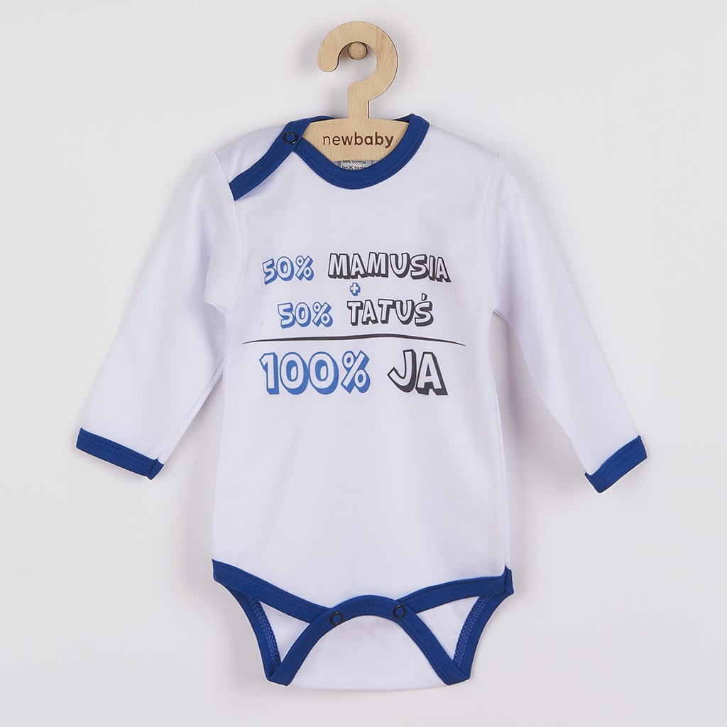 Piękne niemowlęce body z długim rękawem New Baby, z śmiesznym napisem 50% MAMUSIA + 50% TATUŚ - 100% JA. Body jest z lemem wokół szyi, rączek i nóżek. Barwniki używane do druku są certyfikowane i nadaje się dla niemowląt. Zapina się na napy na ramieniu i między nóżkami. Jest wykonane z miękkiej, wartościowej materii. Idealne dla niemowląt. Materiał: 100% bawełna. Rozmiary: obwód wokół piersi 50 cm, długość rękawa 26 cm, długość 42 cm.