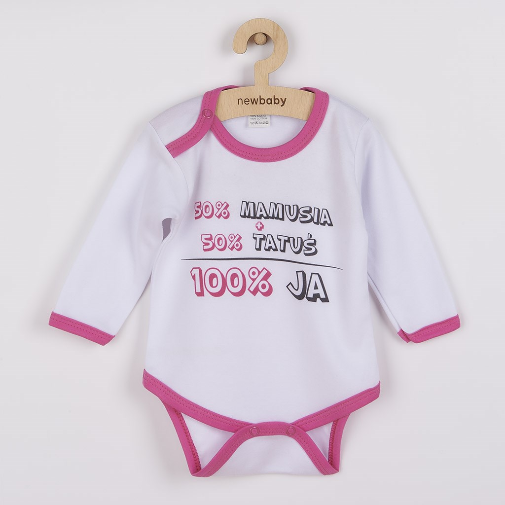 Piękne niemowlęce body z długim rękawem New Baby, z śmiesznym napisem 50% MAMUSIA + 50% TATUŚ - 100% JA. Body jest z lemem wokół szyi, rączek i nóżek. Barwniki używane do druku są certyfikowane i nadaje się dla niemowląt. Zapina się na napy na ramieniu i między nóżkami. Jest wykonane z miękkiej, wartościowej materii. Idealne dla niemowląt. Materiał: 100% bawełna. Rozmiary: obwód wokół piersi 36 cm, długość rękawa 18 cm, długość 32 cm.