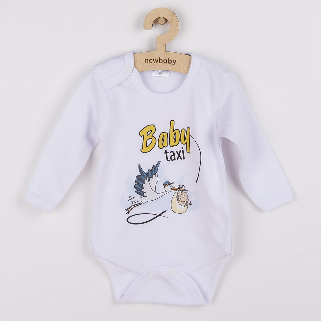 Piękne body z długim rękawem New Baby z obrazkiem i napisem Baby taxi. Wszystkie elementy używane do nadruku są certyfikowane i odpowiednie dla niemowląt. Jest wykonane z miękkiej, wartościowej materii. Zapinanie na napy. Materiał: 100% bawełna.