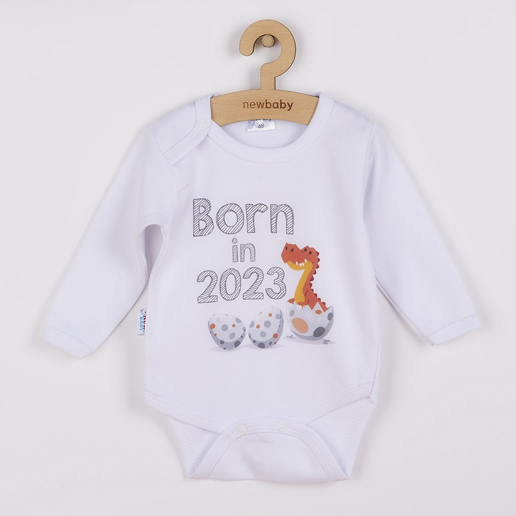 Oryginalne bawełniane body z długim rękawem New Baby z obrazkiem i napisem Born in 2023. Farby używane do druku są certyfikowane i nadają się dla niemowląt. Body jest wykonane z komfortowego i jakościowe materiału, w którym dziecko poczuje się wygodnie. Zapina się na napy. Ubierz dziecko w oryginalne body. Skład: 100% bawełna. Rozmiary: obwód wokół piersi 36 cm, długość rękawa 18 cm, długość 32 cm.