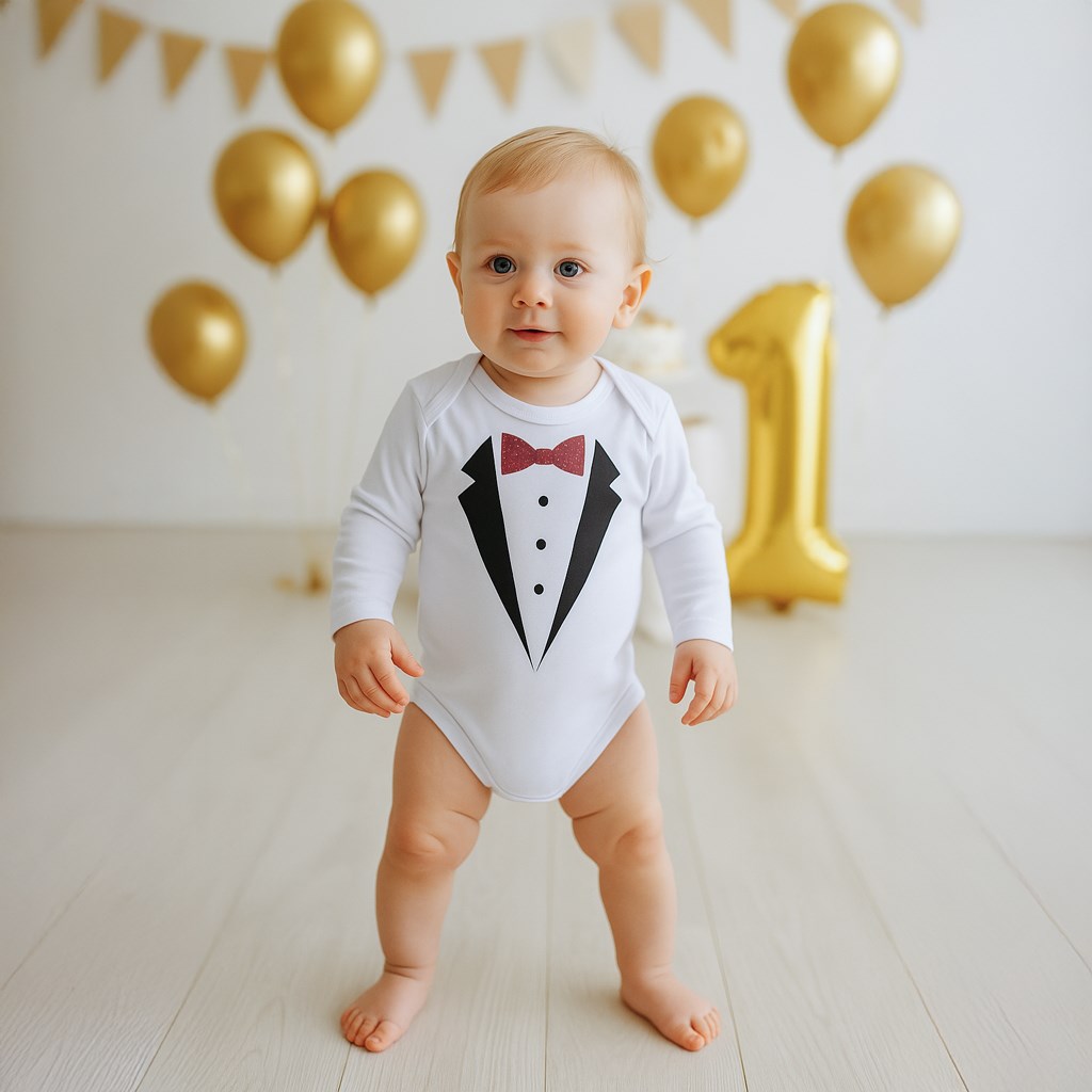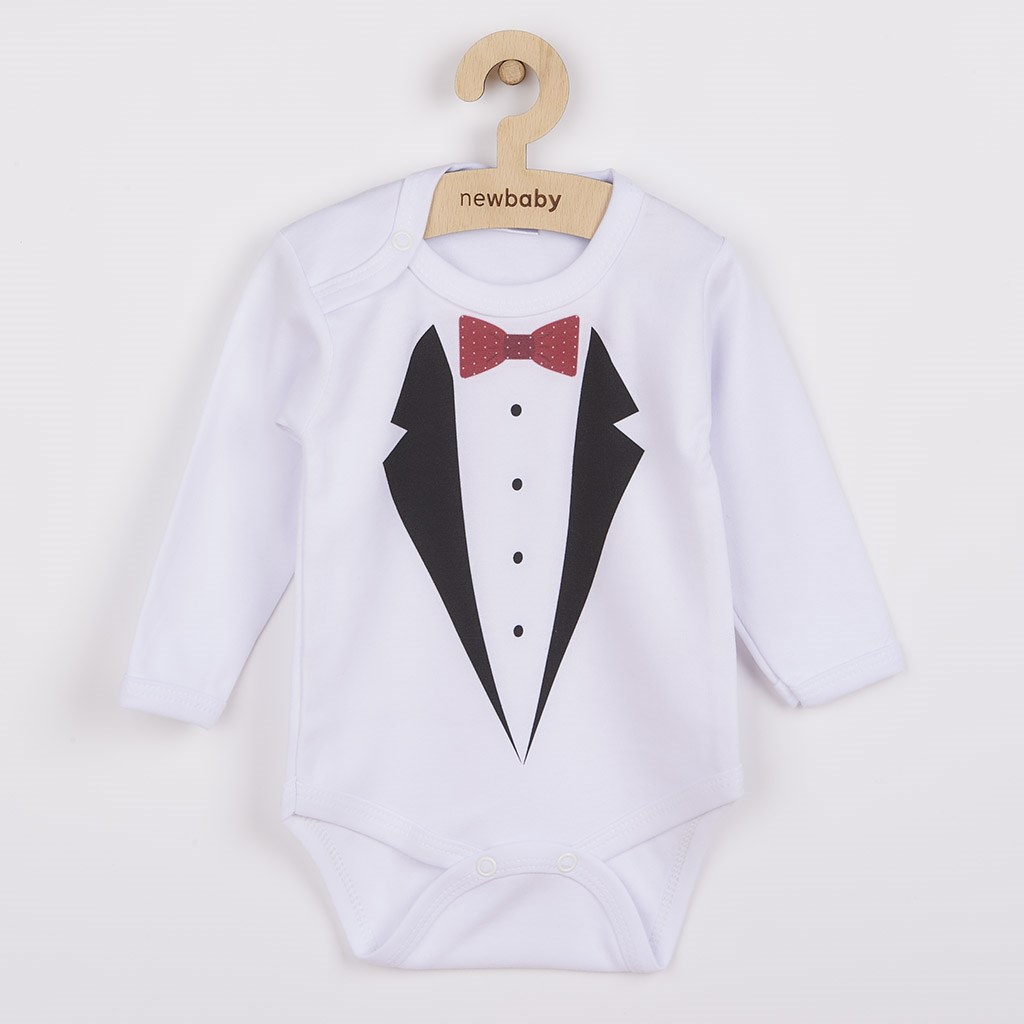 Oryginalne bawełniane body z długim rękawem New Baby z obrazkiem garnituru. Farby używane do druku są certyfikowane i nadają się dla niemowląt. Body jest wykonane z komfortowego i jakościowe materiału, w którym dziecko poczuje się wygodnie. Zapina się na napy. Ubierz dziecko w oryginalne body. Skład: 100% bawełna. Wymiary: obwód wokół klatki piersiowej 40 cm, długość rękawa 22 cm, długość 36 cm.