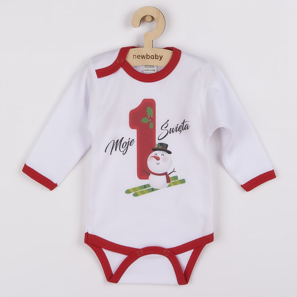 Oryginalne bawełniane body z długim rękawem New Baby, z wesołym napisem Moje 1 Święta i pięknym obrazkiem bałwana na nartach. Body ma kolorową lamówkę. Farby używane do druku są certyfikowane i nadają się dla niemowląt. Body jest wykonane z komfortowego i jakościowe materiału, w którym dziecko poczuje się wygodnie. Zapina się na napy. Ubierz dziecko w oryginalne body. Skład: 100% bawełna. Wymiary: obwód wokół klatki piersiowej 42 cm, długość rękawa 23 cm, długość 38 cm.