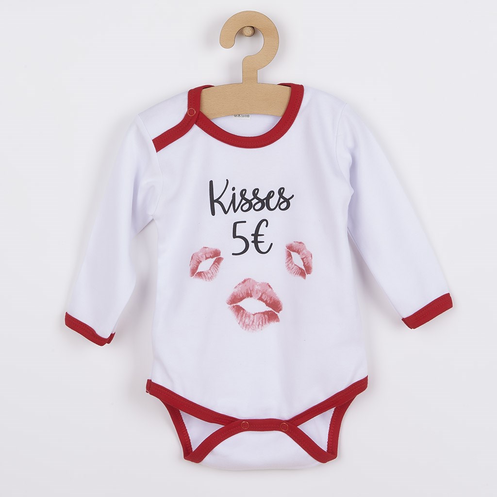 Oryginalne bawełniane body z długim rękawem New Baby z obrazkiem ust i napisem Kisses 5 €. Farby używane do druku są certyfikowane i nadają się dla niemowląt. Body jest wykonane z komfortowego i jakościowe materiału, w którym dziecko poczuje się wygodnie. Zapina się na napy. Ubierz dziecko w oryginalne body. Skład: 100% bawełna. Rozmiary: obwód wokół piersi 50 cm, długość rękawa 26 cm, długość 42 cm.