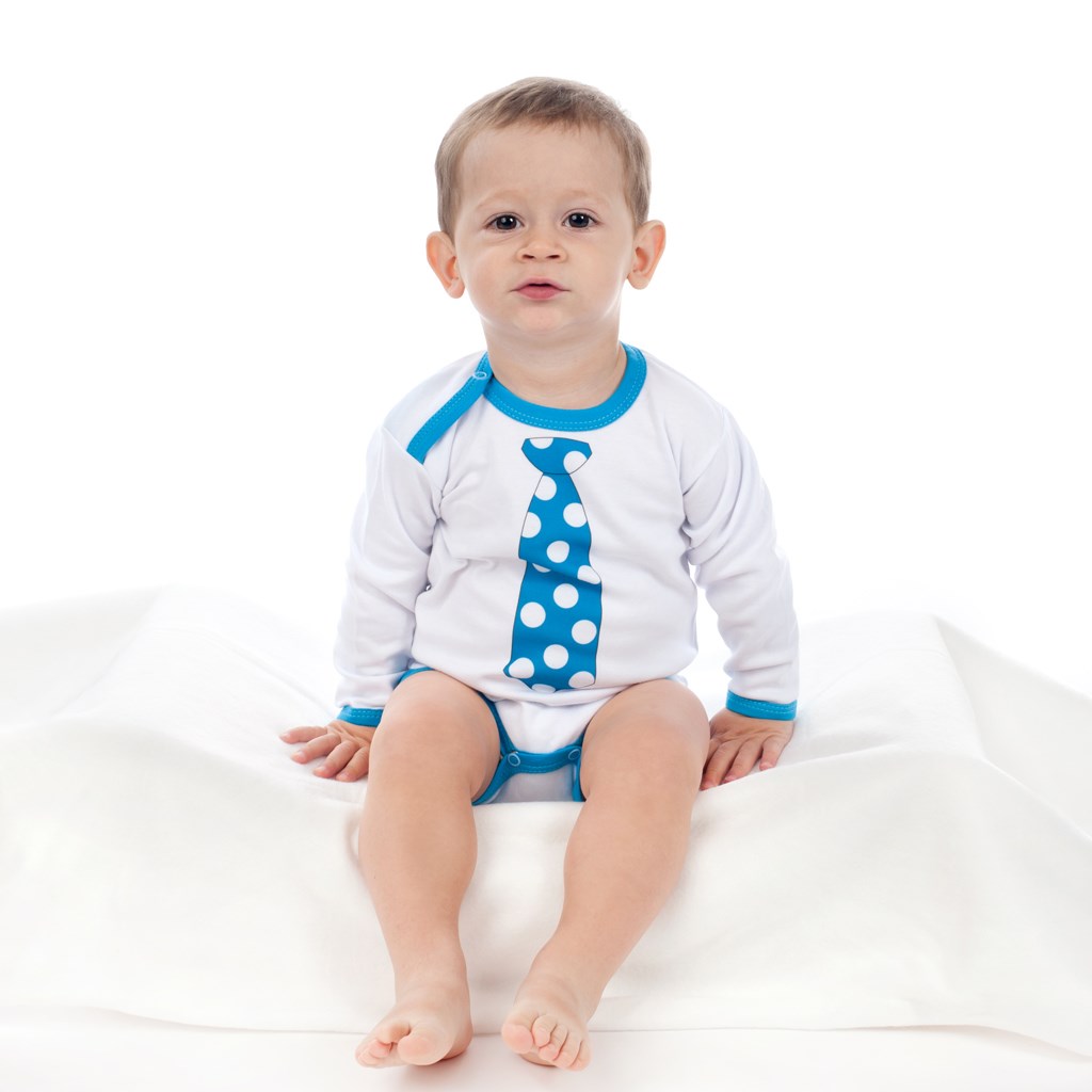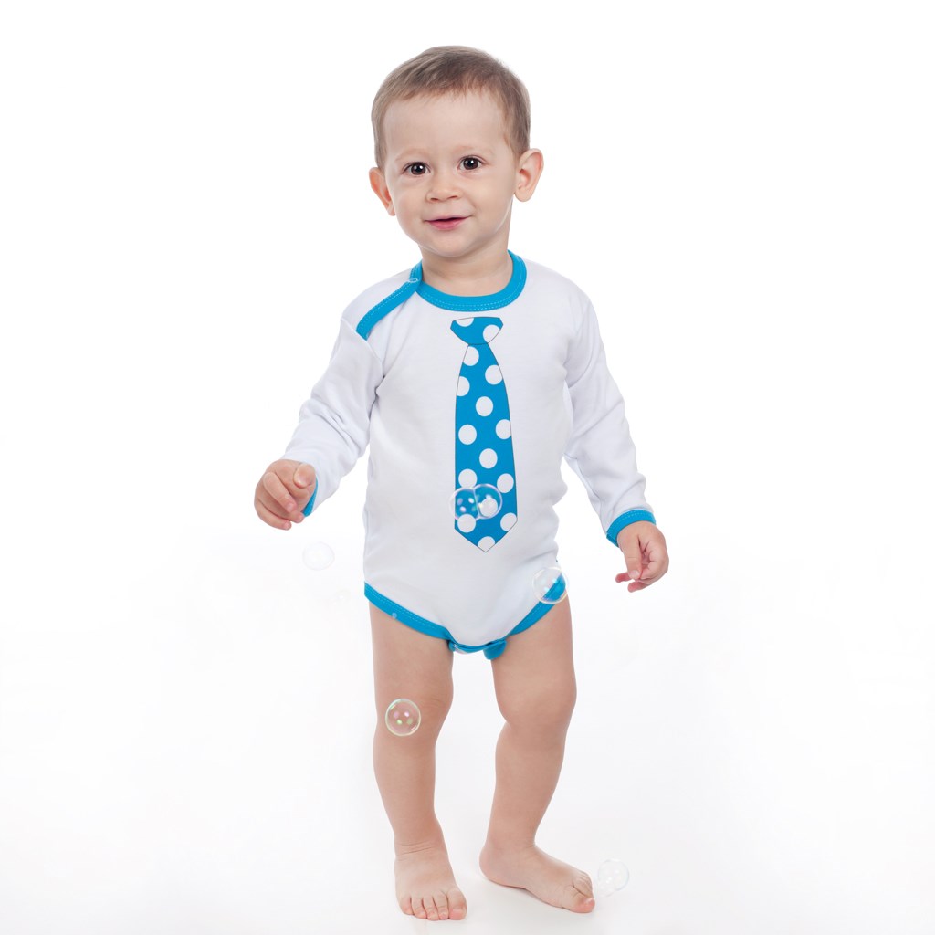 Oryginalne bawełniane body z długim rękawem New Baby z obrazkiem krawaty przyzdobionej kropkami. Body ma kolorową lamówkę. Farby używane do druku są certyfikowane i nadają się dla niemowląt. Body jest wykonane z komfortowego i jakościowe materiału, w którym dziecko poczuje się wygodnie. Zapina się na napy. Ubierz dziecko w oryginalne body. Skład: 100% bawełna. Wymiary: obwód wokół klatki piersiowej 50 cm, długość rękawa 26 cm, długość 42 cm.
