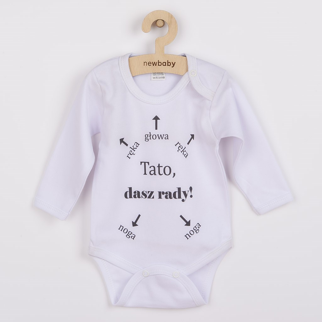 Piękne body z długim rękawem New Baby z napisem Tato, dasz rady! Wszystkie elementy używane do nadruku są certyfikowane i odpowiednie dla niemowląt. Jest wykonane z miękkiej, wartościowej materii. Zapinanie na napy. Materiał: 100% bawełna.