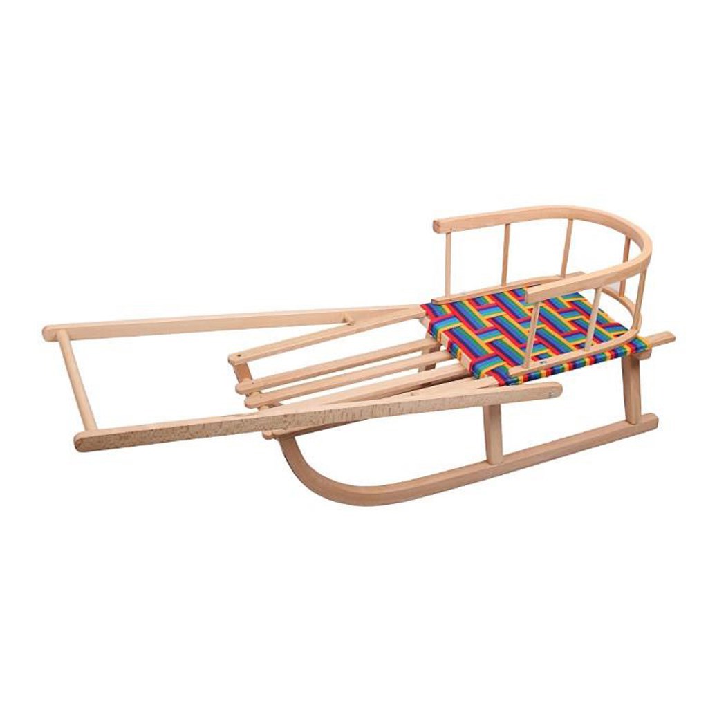 Dziecięce drewniane sanki z uchwytem. Długość 86 cm, szerokość 33 cm, wysokość z oparciem 41 cm. Maksymalne obciążenie 40 Kg.