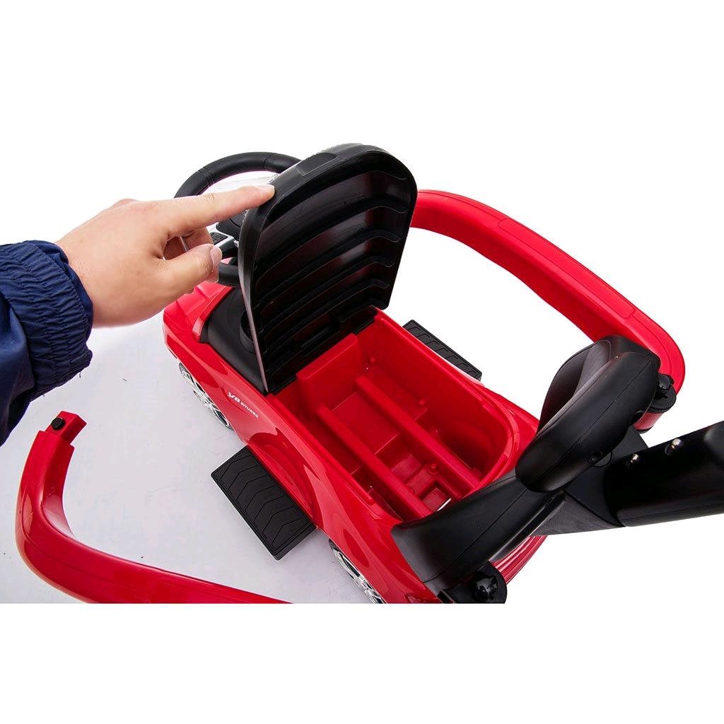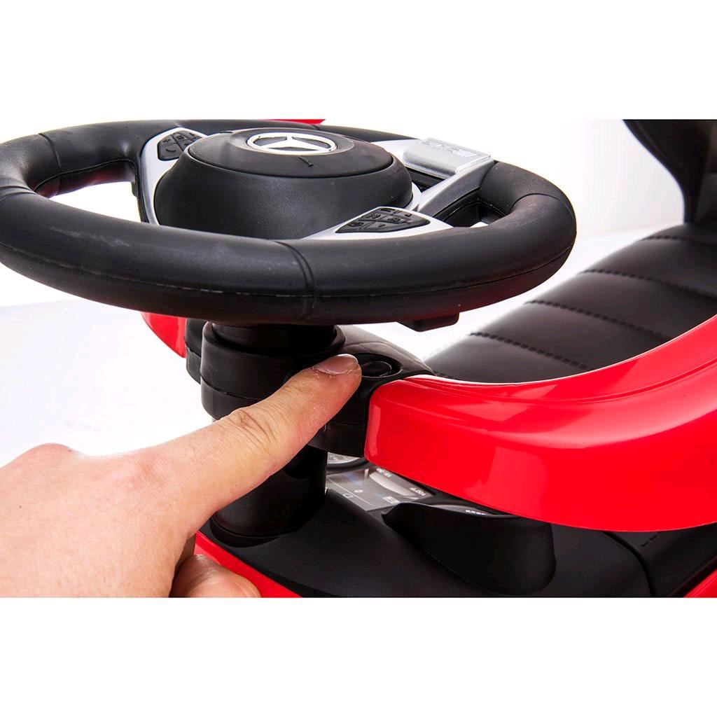 Dziecięcy jeździk z rączką Mercedes Benz Baby Mix, wykonany z wysokiej jakości tworzywa. Jego wygląd przyciąga oko nie tylko dzieci, ale i rodziców. Twój mały rajdowiec poczuje się w nim jak w prawdziwym mercedesie. Jeździk pomaga rozwijać umiejętności motoryczne dziecka, a także gwarantuje dużo zabawy i radości. Na kierownicy znajduje się efektowny klakson oraz przycisk z sześcioma zapisanymi melodiami. Przeznaczony zarówno dla mniejszych dzieci, które mogą siedzieć, jak i dla dzieci, które już nauczyły się chodzić. Ten samochodzik dostarczy naprawdę mnóstwo zabawy. Ma on niepowtarzalny wygląd prawdziwego mercedesa, wygodne szerokie siedzenie z miejscem na zabawki i inne skarby, kierownicę, wysokiej jakości plastikowe koła oraz wygodną i solidną prowadnicę. Z tyłu oparcia znajduje się przycisk, który służy do przełączania funkcji jazdy, koła samochodu są sterowane za pomocą kierownicy. Rączkę, podłokietniki i podnóżki można zdjąć, a tym samym dziecko używa samochodu jako klasycznego jeździka. Po przesunięciu przycisku do pozycji prowadnicy, koła samochodu są kontrolowane przez rodzica za pomocą rączki. Można ją ustawić w dwóch pozycjach. Opakowanie nie zawiera baterii (2x AA 1,5V). Samochód może być używany w następujący sposób: