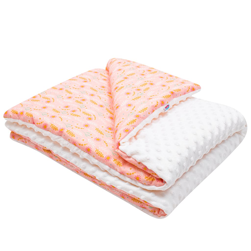 Kocyk dziecięcy New Baby Minky wykonany jest z dwóch rodzajów tkaniny, przyjemnej w dotyku Minky i 100% bawełny. Wykonany jest z wysokiej jakości materiału, który nie farbuje i nie powoduje reakcji alergicznych. Koc może być używany zarówno w domu, jak i na zewnątrz, w wózku, łóżeczku lub foteliku samochodowym. Koc jest bardzo przyjemny i miękki w dotyku.