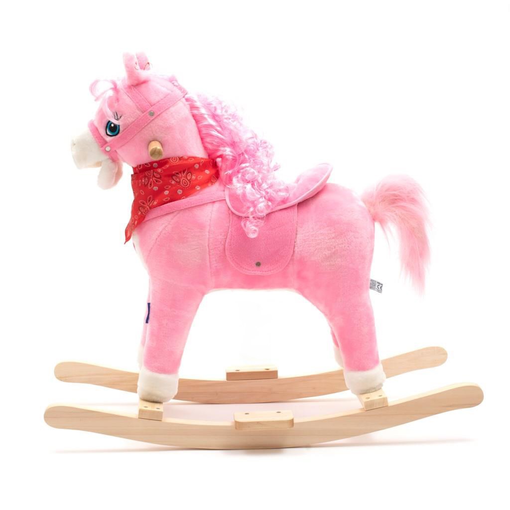 Przepiękny konik na biegunach został zaprojektowany z myślą o dzieciach lubiących przygody. Wygodne siodło, kantar, strzemiona, drewniane rączki i płozy zapewnią komfort i bezpieczeństwo podczas beztroskiego bujania maluszka. Konik przyozdobiony jest w przepiękną chustę. Przy naciśnięciu uszek rozlegnie się odgłos galopującego konika, konik macha ogonem, rusza pyskiem czy też zaśpiewa piosenkę. Maluszek bawiąc się musi skoordynować ruchy z konikiem co stymuluje jego koordynację ruchową i rozwija wyobraźnię oraz poprawia poczucie równowagi. Kieszeń z bateriami ukryta jest pod brzuszkiem konika. Baterie nie są dokładane.
