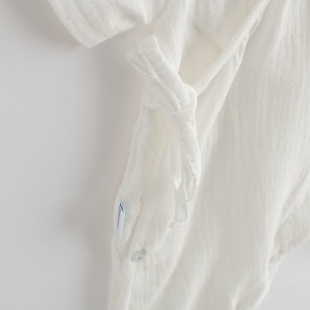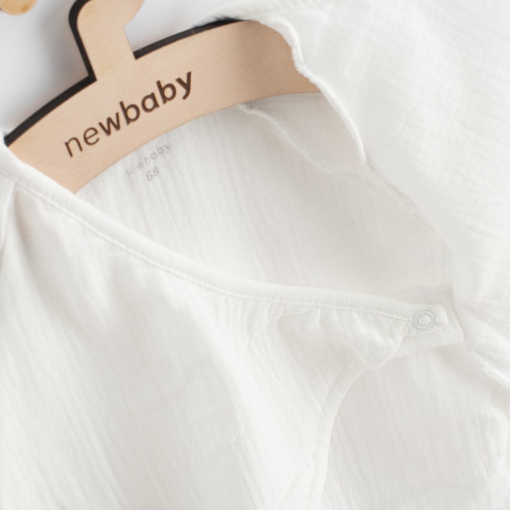 Stylowy letni muślinowy kombinezon z krótkim rękawem New Baby Soft Dress. Posiada praktyczne zapięcie na całej długości na boczne sznurki ściągające, co ułatwia ubieranie i przebieranie. Piękny letni kombinezon, który rozjaśni uśmiech wszystkich dzieci. Skład: 100% bawełna.Muślin jest jedną z najczystszych, najprostszych i najdelikatniejszych tkanin na świecie. Drobno tkany, oddychający materiał jest tak doskonały, że pokochały je dzieci na całym świecie. Luźny splot pozwala muślinowi „oddychać” i zapewnia wystarczającą cyrkulację powietrza, zmniejszając ryzyko przegrzania. Ta jego cecha pomaga zapewnić dziecku wygodę i bezpieczeństwo, a rodzicom spokój. Muślin jest bardzo trwały, dzięki czemu bez problemu poradzi sobie z wielokrotnym praniem, a z czasem staje się cieńszy i bardziej miękki.
