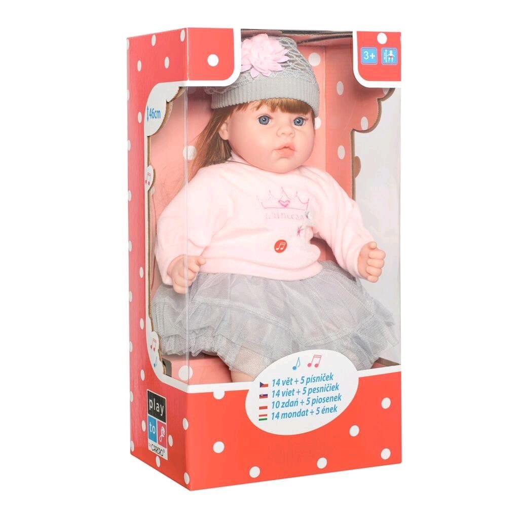 Piękna dziecięca lalka PlayTo. Ciało lalki wykonane jest z miękkiego materiału a ręce, nogi i głowa jest z gumy. Lalka ma ładne ubranie, które można złożyć i wyprać. Długość lalki 46 cm. Lalka ma czeski modul i mówi czeskie zdania i słowa jak: