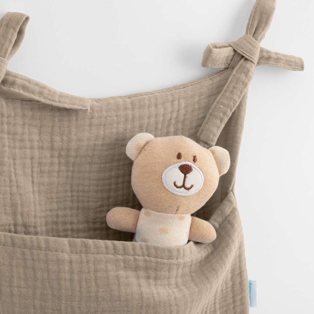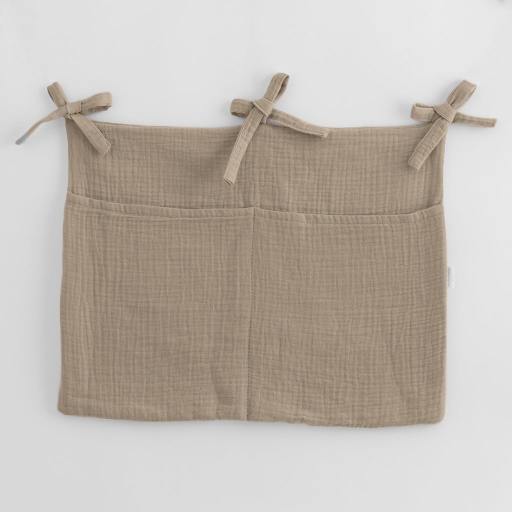 Muślinowy organizer to idealne akcesorium do uzupełnienia zestawu dla dziecka. Mocuje się do łóżeczka za pomocą pasków i pozwala mieć pod ręką niezbędne rzeczy dla dziecka.