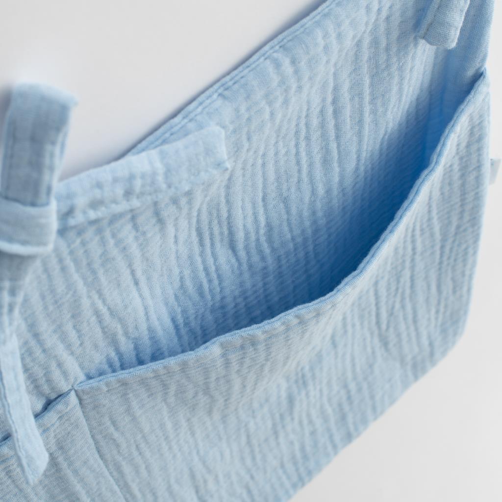 Muślinowy organizer to idealne akcesorium do uzupełnienia zestawu dla dziecka. Mocuje się do łóżeczka za pomocą pasków i pozwala mieć pod ręką niezbędne rzeczy dla dziecka.