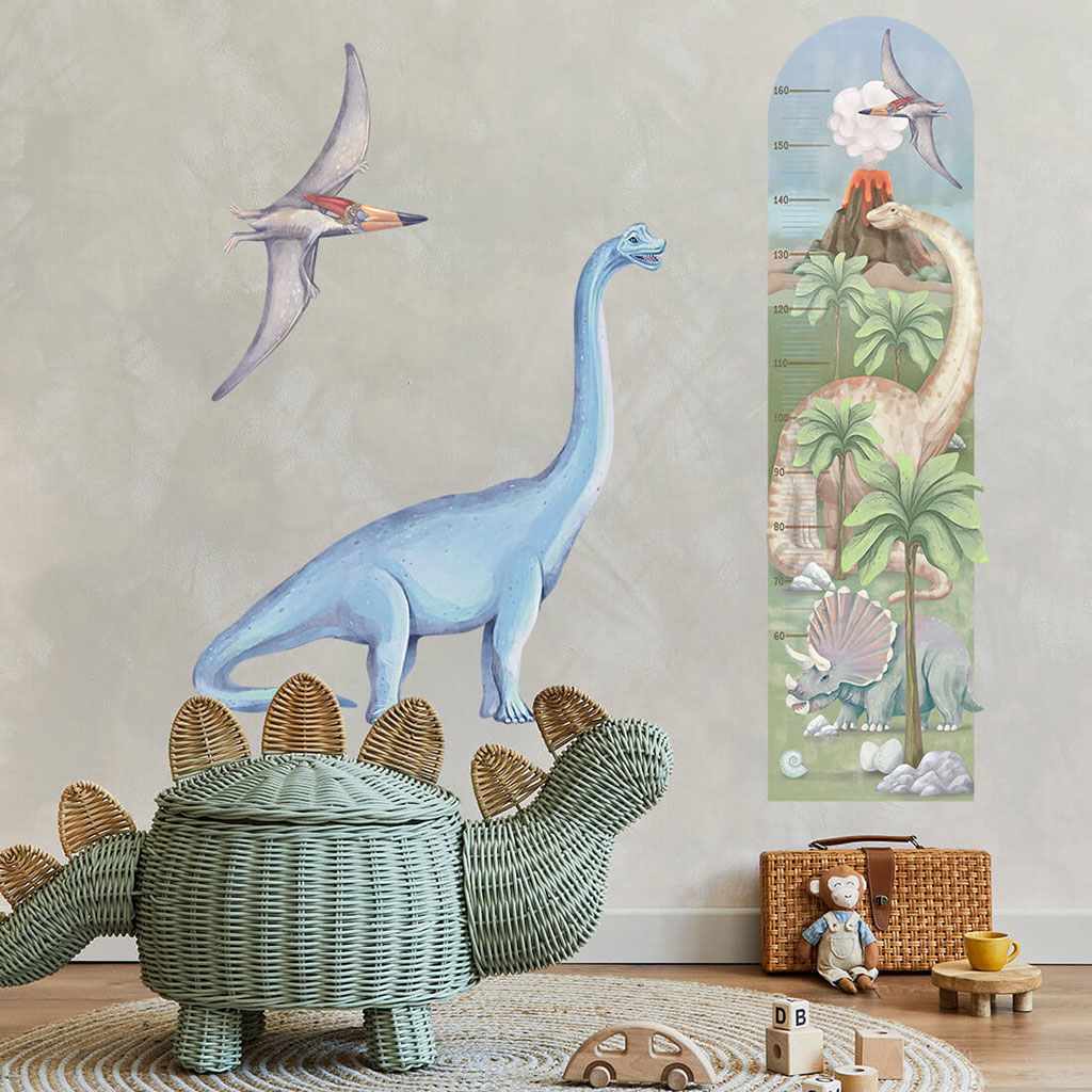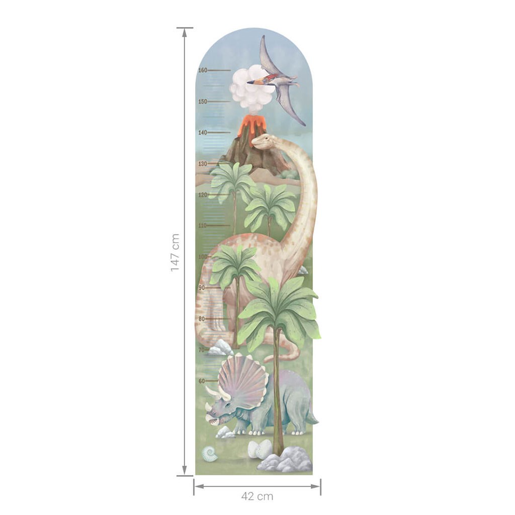 Urocza naklejka na ścianę Dino – miarka wzrostu. Zaznaczanie wzrostu dzieci w kolejnych etapach ich życia to tradycja kultywowana od pokoleń. Oferujemy jedyne w swoim rodzaju miarki wzrostu w formie naklejek, które można przykleić w dowolnym miejscu i odnotowywać na nich kolejne centymetry wzrostu dziecka. Wybierając dinozaury do mierzenia wzrostu i dodając inne naklejki na ścianę, stworzysz wyjątkową przestrzeń dla swojego dziecka. Naklejka zabezpieczona jest specjalnym matowym laminatem, który chroni ją przed zarysowaniami podczas codziennego użytkowania, a dodatkowo ułatwia przyklejanie - folia jest grubsza i łatwiej przenosi się ją na ścianę. Jeśli szukasz sposobu na ożywienie pokoju dziecięcego, nasze naklejki na ścianę to idealny wybór. Zamów je jeszcze dziś i spraw radość swojemu dziecku. Na miarce można zaznaczać wzrost od 50 do 160 cm. Wymiary naklejki: 42 x 147 cm. Dokładne wymiary poszczególnych elementów podano na ostatnim zdjęciu.