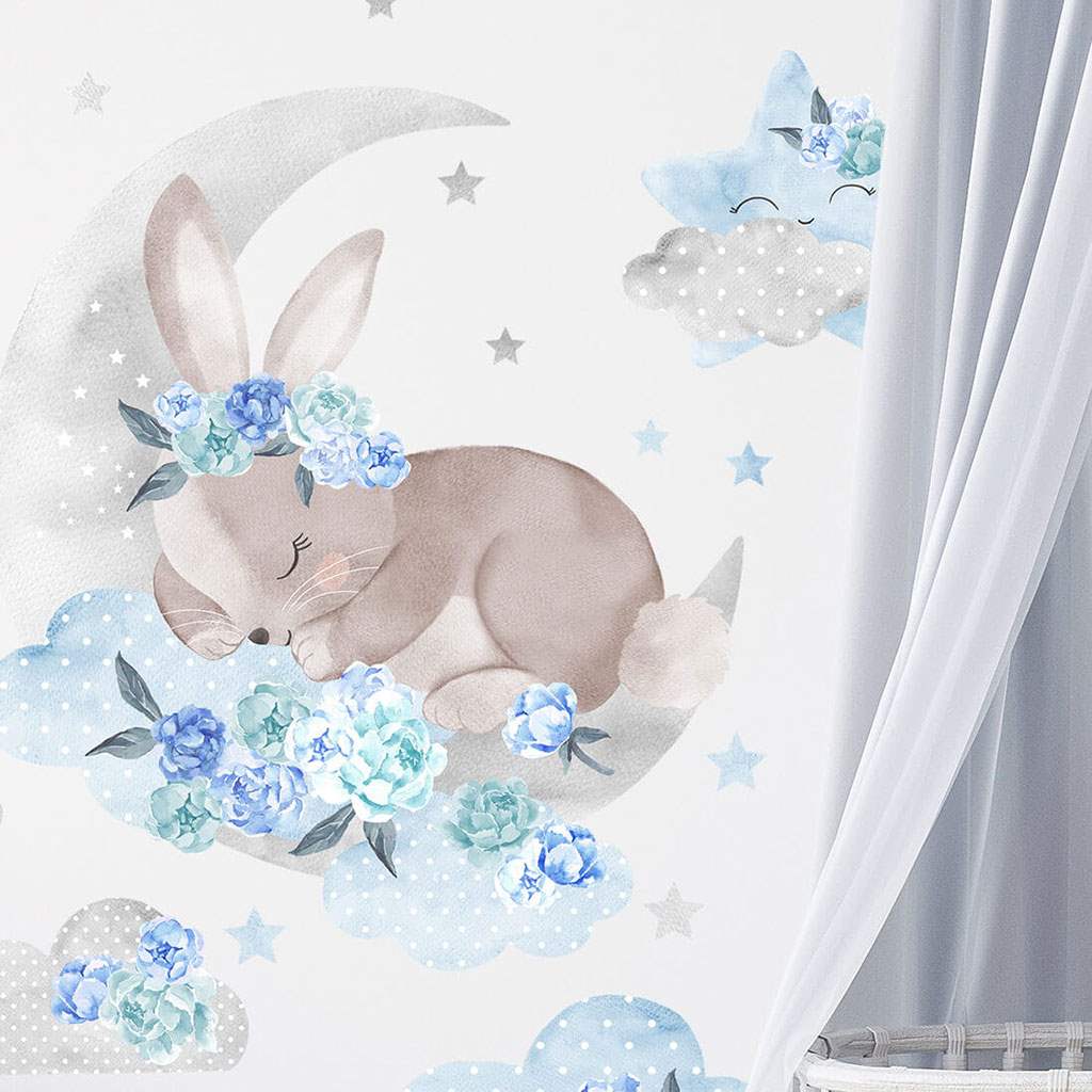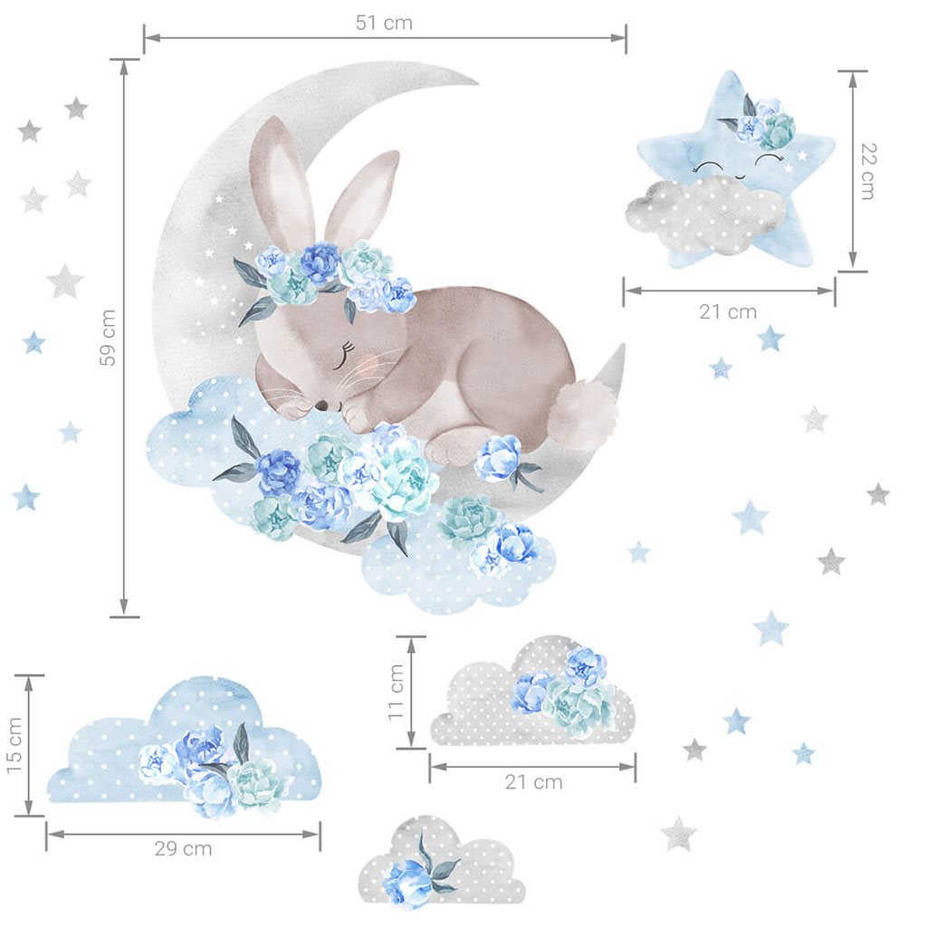 Urocza naklejka na ścianę Śpiący królik. Naklejka Niebieski śpiący królik pochodzi z kolekcji z piwoniami, która powstała z myślą o wszystkich miłośnikach motywów kwiatowych i leśnych zwierząt. Zaprojektowano ją w nietypowy sposób: pierwszym krokiem było przygotowanie szkiców całej kolekcji, następnie pomalowano je farbami akwarelowymi na specjalnym papierze, zaś na samym końcu, przy użyciu technologii komputerowej, przygotowane zostały materiały do druku. Tak zaawansowany proces sprawia, że kolekcja ta jest wyjątkowa pod każdym względem. Naklejka zabezpieczona jest specjalnym matowym laminatem, który chroni ją przed zarysowaniami podczas codziennego użytkowania, a dodatkowo ułatwia przyklejanie – folia jest grubsza i łatwiej przenosi się ją na ścianę. Poszczególne elementy można rozmieścić na ścianie wedle własnej fantazji. Jeśli szukasz sposobu na ożywienie pokoju dziecięcego, nasze naklejki na ścianę to idealny wybór. Zamów je jeszcze dziś i spraw radość swojemu dziecku. W skład zestawu wchodzą: śpiący królik z chmurkami (51 x 59 cm) oraz elementy dodatkowe (małe gwiazdy, chmurki). Dokładne wymiary poszczególnych elementów podano na ostatnim zdjęciu.