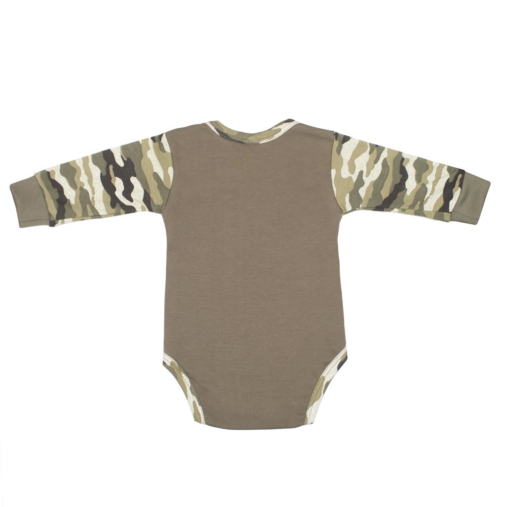 Stylowe, bawełniane body niemowlęce z długim rękawem New Baby Army. Dziecięce body w barwach moro z napisem DADDY´S BRAVE GIRL. Wokół szyi, na nogawek i rękawów znajduje się wykończenie w moro. Rękawy mają elastyczny brzeg, który nie uciska i ułatwia ubieranie. Nasze body jest urocze i stylowe. Praktyczne zapięcie na napy na ramieniu i między nogami znacznie ułatwia ubieranie i przewijanie. Body jest ważnym elementem garderoby niemowlaka. Przy każdym ruchu plecy dziecka są idealnie zakryte. Styl wojskowy powrócił do mody i znowu zachwyca. Kładziemy nacisk na jakość, dlatego dzięki wykorzystaniu przyjemnego i miękkiego materiału wysokiej jakości Twoje dziecko będzie czuć się bardzo komfortowo. Skład: 100% bawełna.
