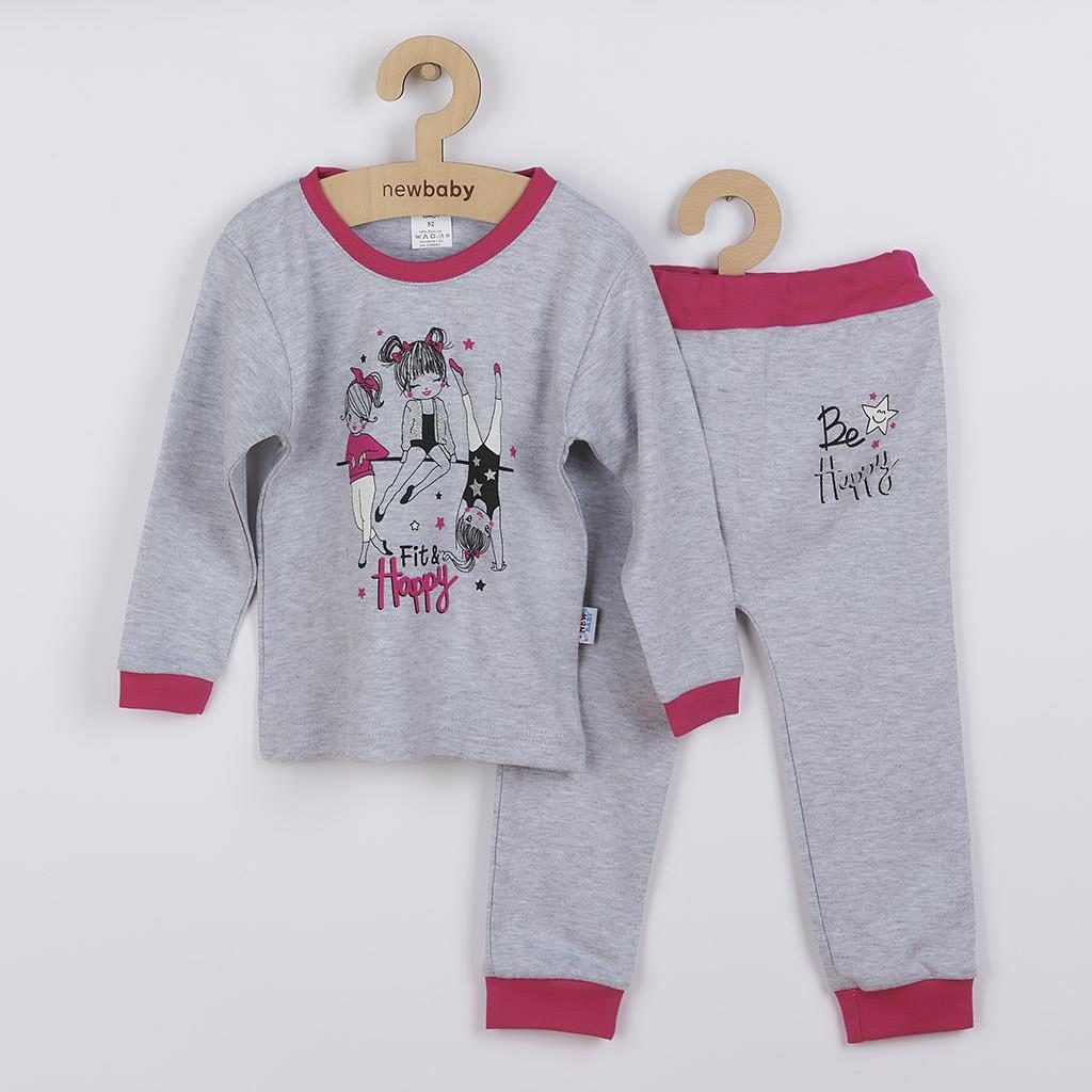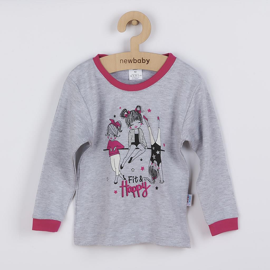 Stylowe dziecięce spodnie dresowe i koszulka czeskiej marki New Baby. Koszulka ma kolorowe, elastyczne obszycie wokół szyi, dzięki czemu łatwo się ją zakłada przez głowę dziecka. Jest ozdobiona obrazkiem małych dziewczynek, napisem "Fit and Happy" oraz uwielbianym przez dziewczynki błyszczącym brokatem. Dresy posiadają szerokie, kolorowe, wykończenie na nogawkach, szeroki, kolorowy pasek z gumką oraz stylowo, obniżony krok, który nadaje zestawowi odpowiedni „look”. Spodnie są ozdobione napisem Be Happy i błyszczącym brokatem. Komplet idealny do wózka, fotelika samochodowego i jako wygodny ubiór po domu. Ma wszechstronne zastosowanie. Materiał jest miękki, lekki i przyjemny. Nowoczesny styl i krój sprawiają, że komplet jest niezwykle twarzowy. Materiał: 100% bawełna.