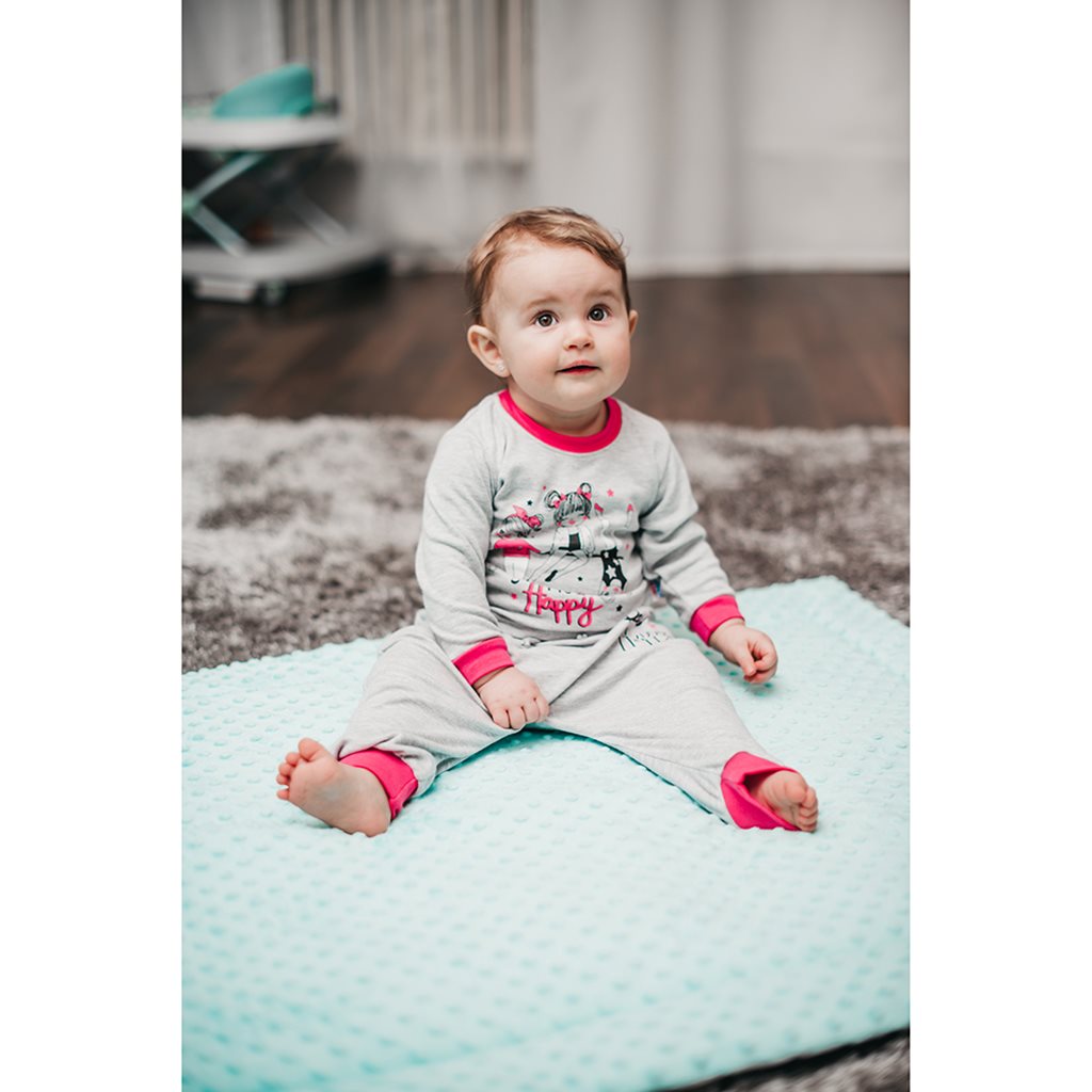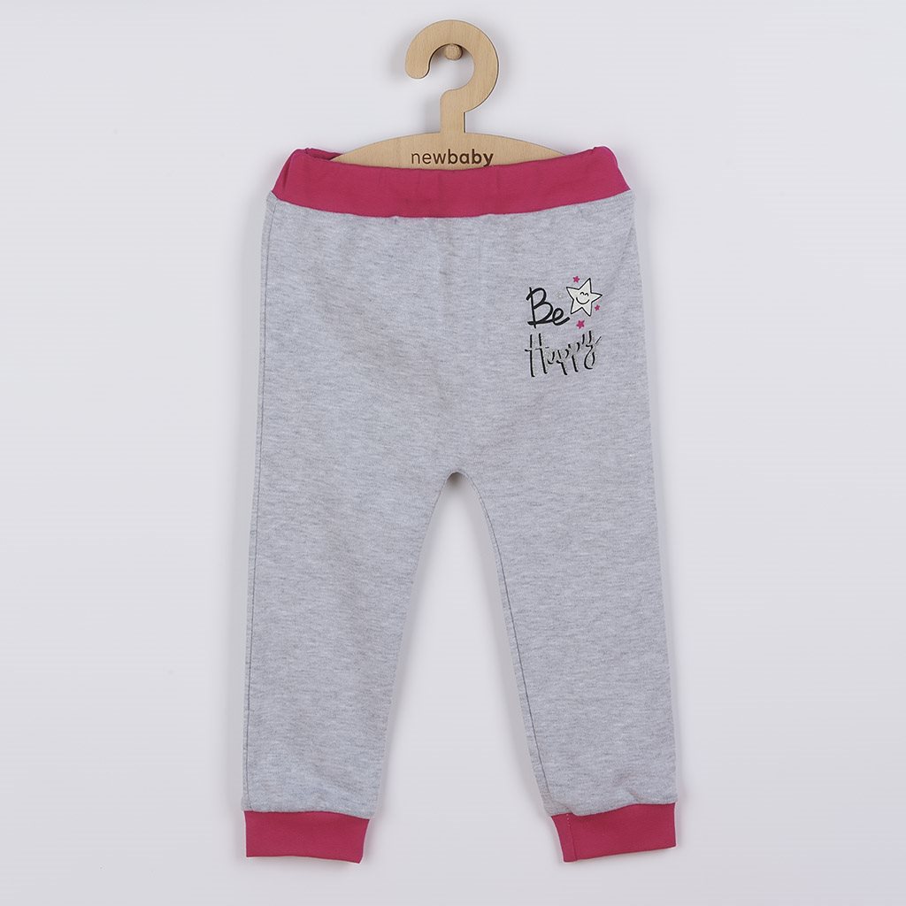 Stylowe dziecięce spodnie dresowe i koszulka czeskiej marki New Baby. Koszulka ma kolorowe, elastyczne obszycie wokół szyi, dzięki czemu łatwo się ją zakłada przez głowę dziecka. Jest ozdobiona obrazkiem małych dziewczynek, napisem "Fit and Happy" oraz uwielbianym przez dziewczynki błyszczącym brokatem. Dresy posiadają szerokie, kolorowe, wykończenie na nogawkach, szeroki, kolorowy pasek z gumką oraz stylowo, obniżony krok, który nadaje zestawowi odpowiedni „look”. Spodnie są ozdobione napisem Be Happy i błyszczącym brokatem. Komplet idealny do wózka, fotelika samochodowego i jako wygodny ubiór po domu. Ma wszechstronne zastosowanie. Materiał jest miękki, lekki i przyjemny. Nowoczesny styl i krój sprawiają, że komplet jest niezwykle twarzowy. Materiał: 100% bawełna.