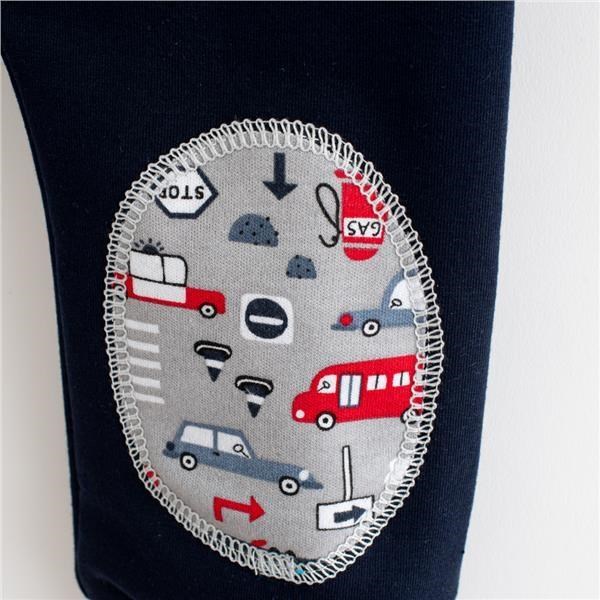 Nowoczesne i praktyczne spodnie dresowe New Baby Go!go!go! Spodnie dresowe posiadają szersze wykończenie z gumką w talii, szerszą lamówkę na nogawkach i łaty na kolanach ozdobione w samochody. Skład: 95% bawełna, 5% elastan. Kolekcją Go! go! go! zawiera: body z krótkim rękawem, bluza z krótkim rękawam, spodnie dresowe i czapka i szorty.