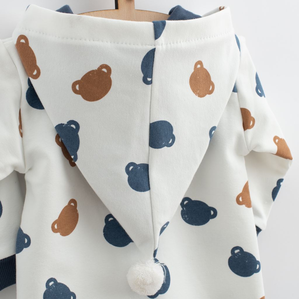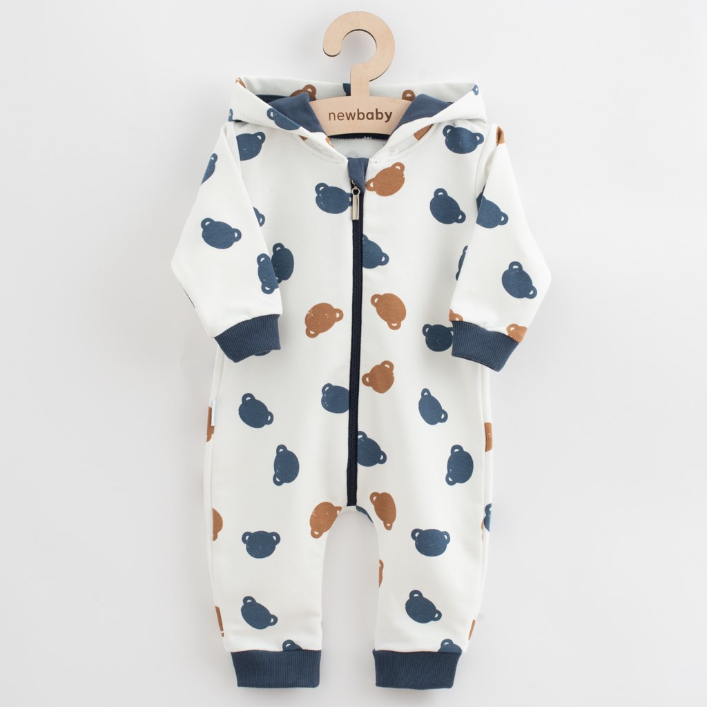 Uroczy i praktyczny kombinezon z kapturem New Baby Little One. Kombinezon ma nadruk z misiami, zapięcie na zamek błyskawiczny na całej długości i elastyczne obszycia na rękawach i nogawkach. Kaptur podszyty jest kolorową podszewką i ozdobiony uroczym pomponem. Kombinezon wykonany jest z wygodnej tkaniny dresowej. Nadaje się do noszenia przez cały rok. Materiał: 96% bawełna, 4% elastan.