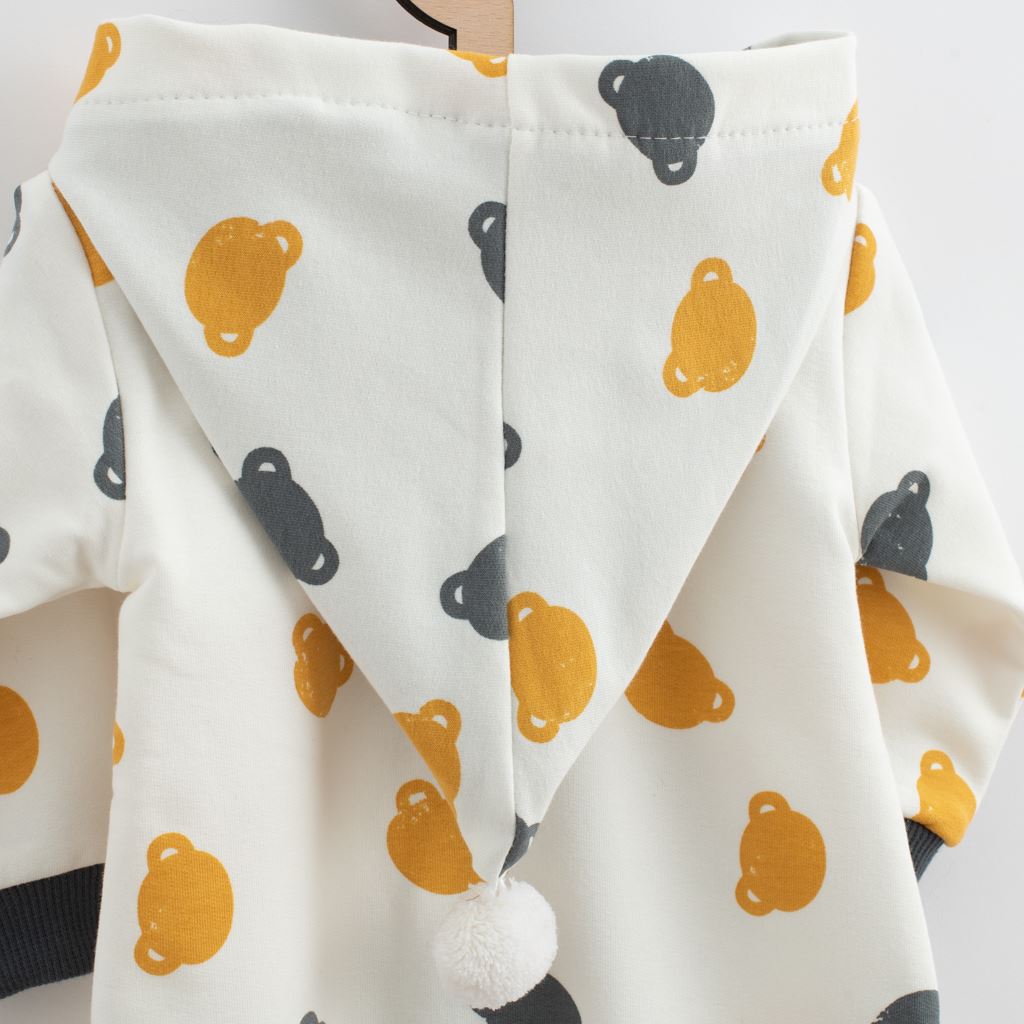 Uroczy i praktyczny kombinezon z kapturem New Baby Little One. Kombinezon ma nadruk z misiami, zapięcie na zamek błyskawiczny na całej długości i elastyczne obszycia na rękawach i nogawkach. Kaptur podszyty jest kolorową podszewką i ozdobiony uroczym pomponem. Kombinezon wykonany jest z wygodnej tkaniny dresowej. Nadaje się do noszenia przez cały rok. Materiał: 96% bawełna, 4% elastan.