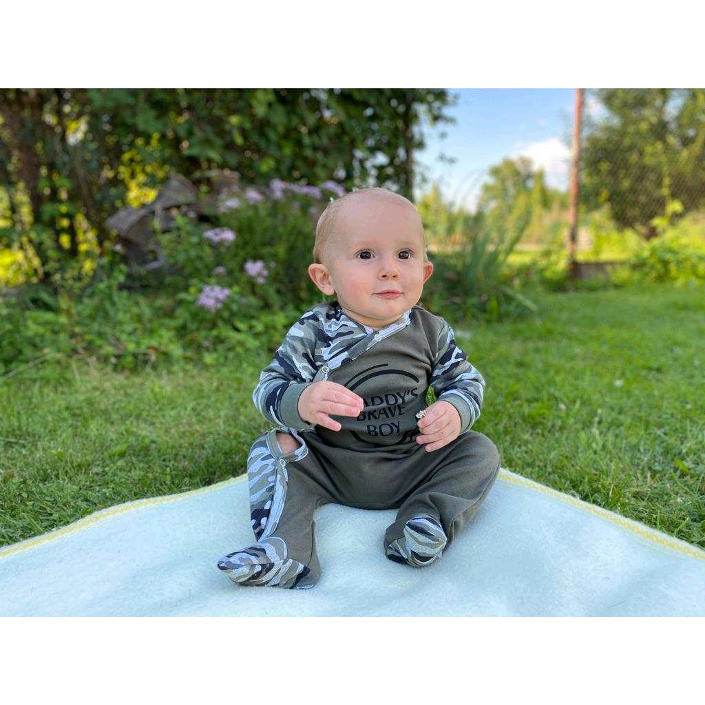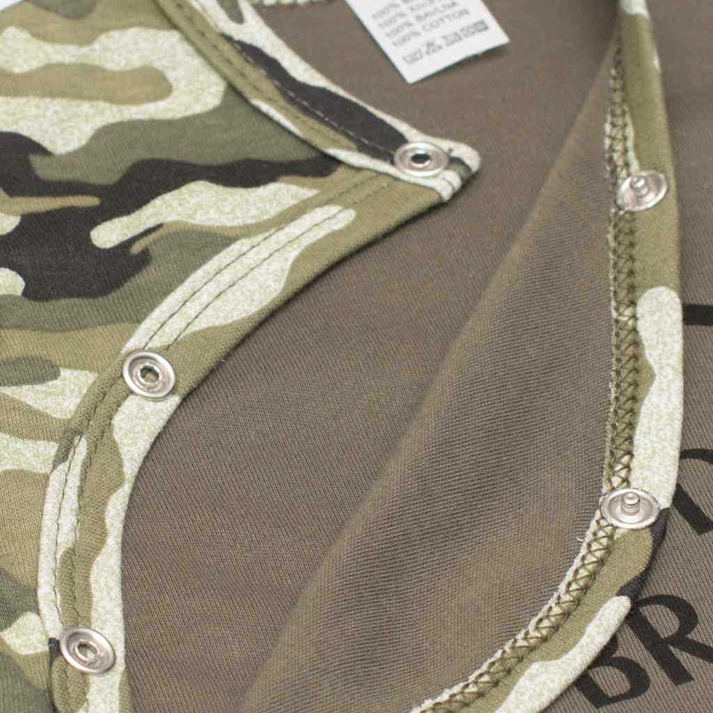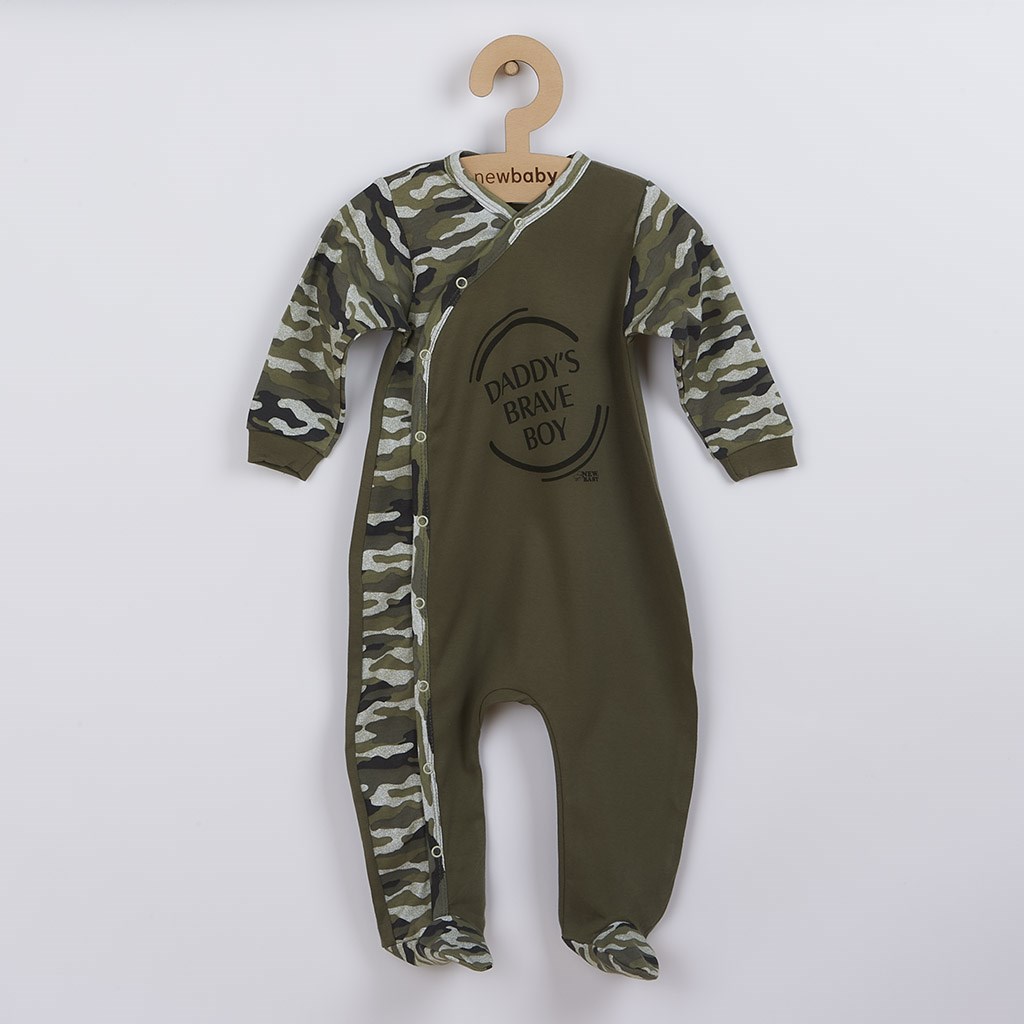Stylowy, bawełniany pajacyk niemowlęcy New Baby Army. Dziecięcy pajacyk w barwach moro z napisem DADDY´S BRAVE BOY. Na rękawach znajduje się elastyczne wykończenie, które nie uciska i ułatwia ubieranie. Pajac jest ważnym elementem garderoby niemowlaka. Przy każdym ruchu plecy dziecka są idealnie zakryte. Praktyczne, boczne zapięcie na napy na całej długości i między nogami znacznie ułatwia ubieranie i przewijanie. Styl wojskowy powrócił do mody i znowu zachwyca. Kładziemy nacisk na jakość, dlatego dzięki wykorzystaniu przyjemnego i miękkiego materiału wysokiej jakości Twoje dziecko będzie czuć się bardzo komfortowo. Skład: 100% bawełna.