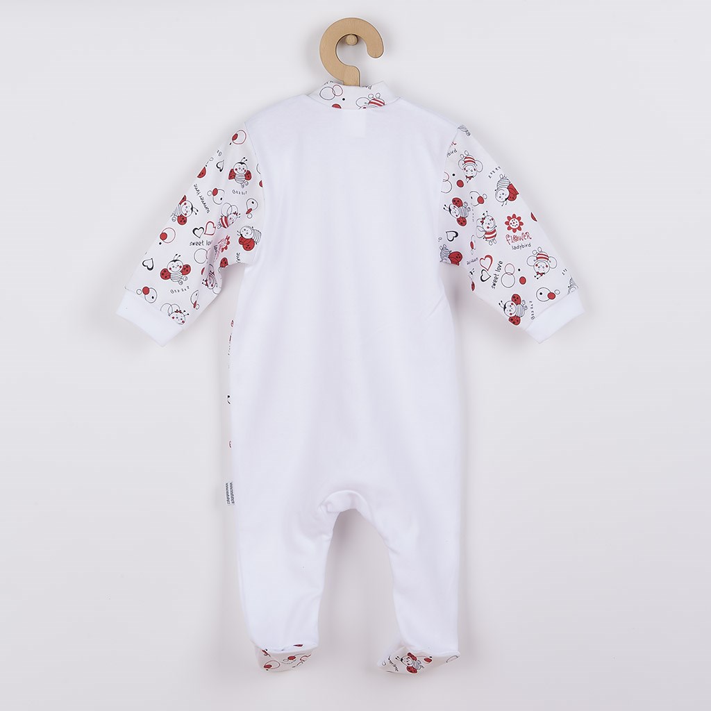 Bawełniany pajac New Baby Biedronka. Pajac jest biało-czerwony z obrazkiem biedronek. Skład: 100% bawełna. Wymiary: obwód wokół klatki piersiowej 60 cm, długość 58 cm, długość rękawa 27 cm, długość od krocza 20 cm.