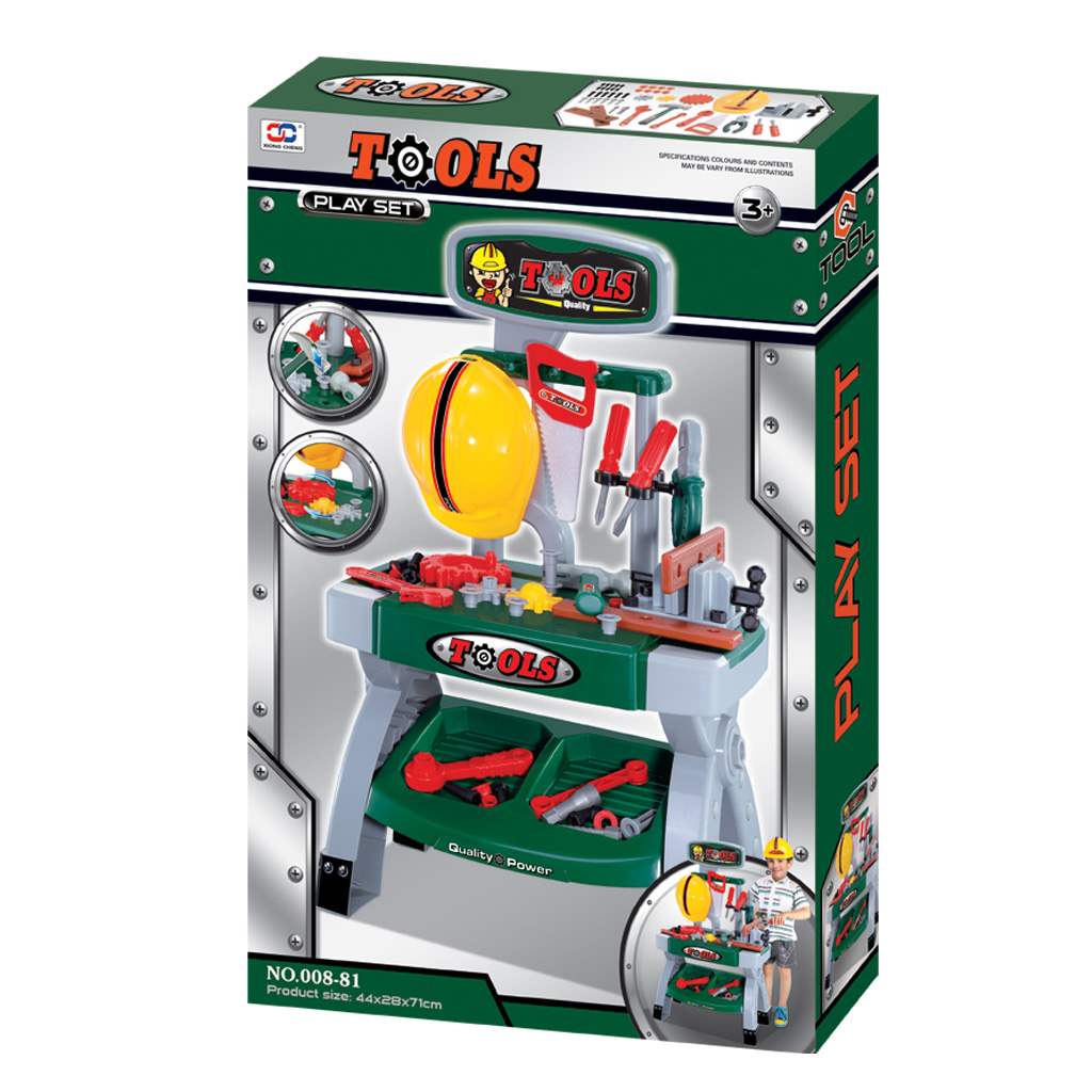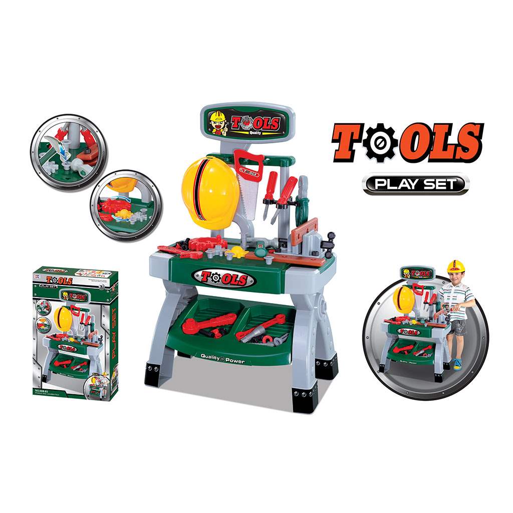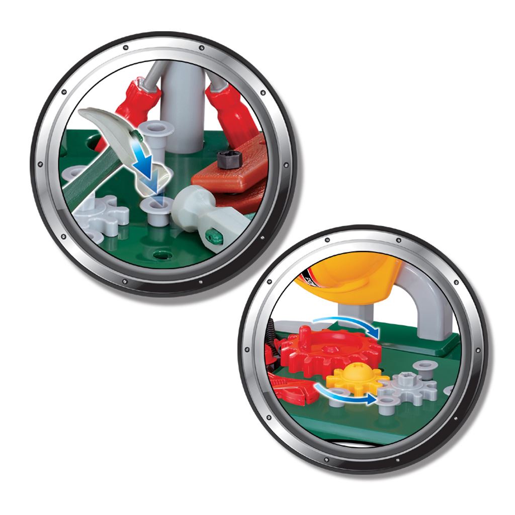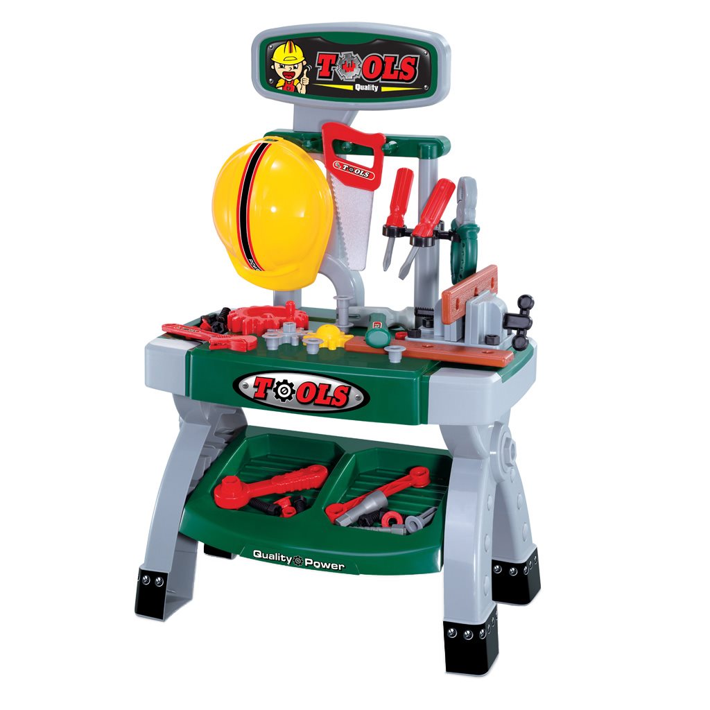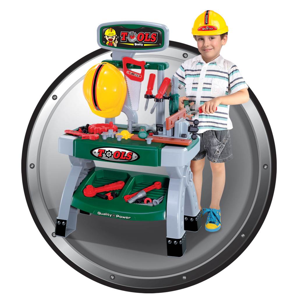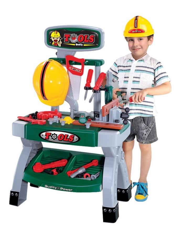 Warsztat dla chłopców z narzędziami. Uczy dzieci rozróżniać kształty i kolory, każde narzędzie jest w innym kształcie. Zabawka pomaga rozwijać manualne umiejętności i zręczność, rozwija wyobraźnię i koncentrację dziecka. Warsztat wykonany jest z wysokiej jakości tworzywa sztucznego. Opakowanie zawiera również śruby, gwoździe, nakrętki i koła zębate. Zabawka jest przeznaczona dla dzieci od 3 lat.