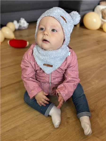 Zimowa czapeczka dla niemowląt z chustką pod szyję New Baby Teddy bear szaro różowa