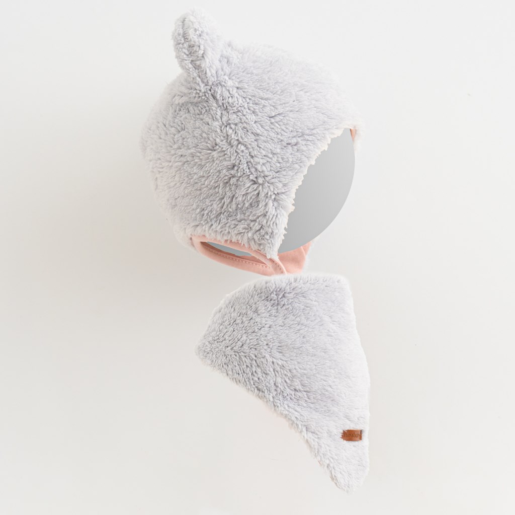 Zimowa czapeczka dla niemowląt z chustką pod szyję New Baby Teddy bear szaro różowa