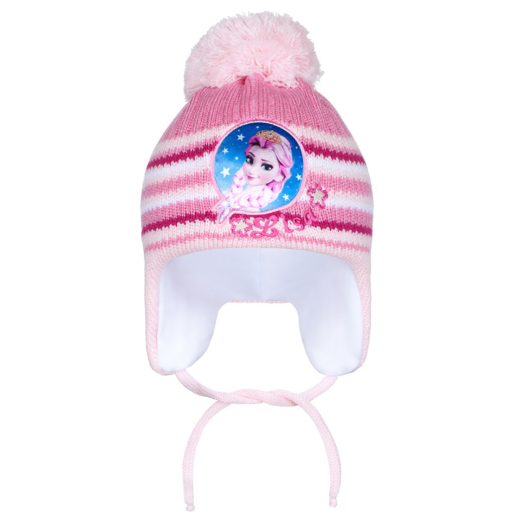 Śliczna zimowa czapka z dzianiny New Baby. Czapka jest ozdobiona obrazkiem księżniczki. Ma elastyczny lem, zawiązuje się na sznurki. Skład: 100% bawełna. Obwód wokół głowy 44-48 cm.