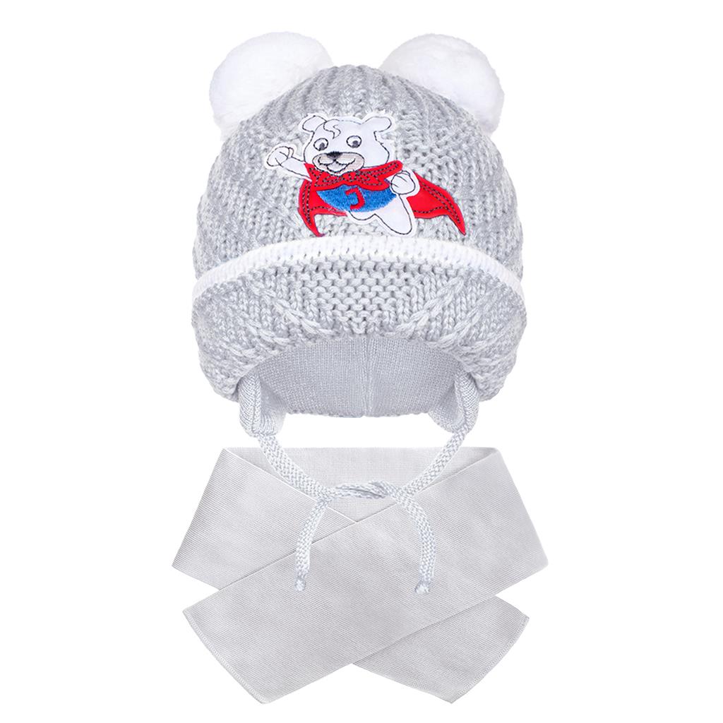 Śliczna zimowa czapka z dzianiny z szalikiem New Baby. Czapka jest ozdobiona obrazkiem misia. Ma elastyczny lem, zawiązuje się na sznurki. Skład: 100% bawełna. Obwód wokół głowy 44-48 cm. Szalik: 96 cm.